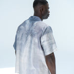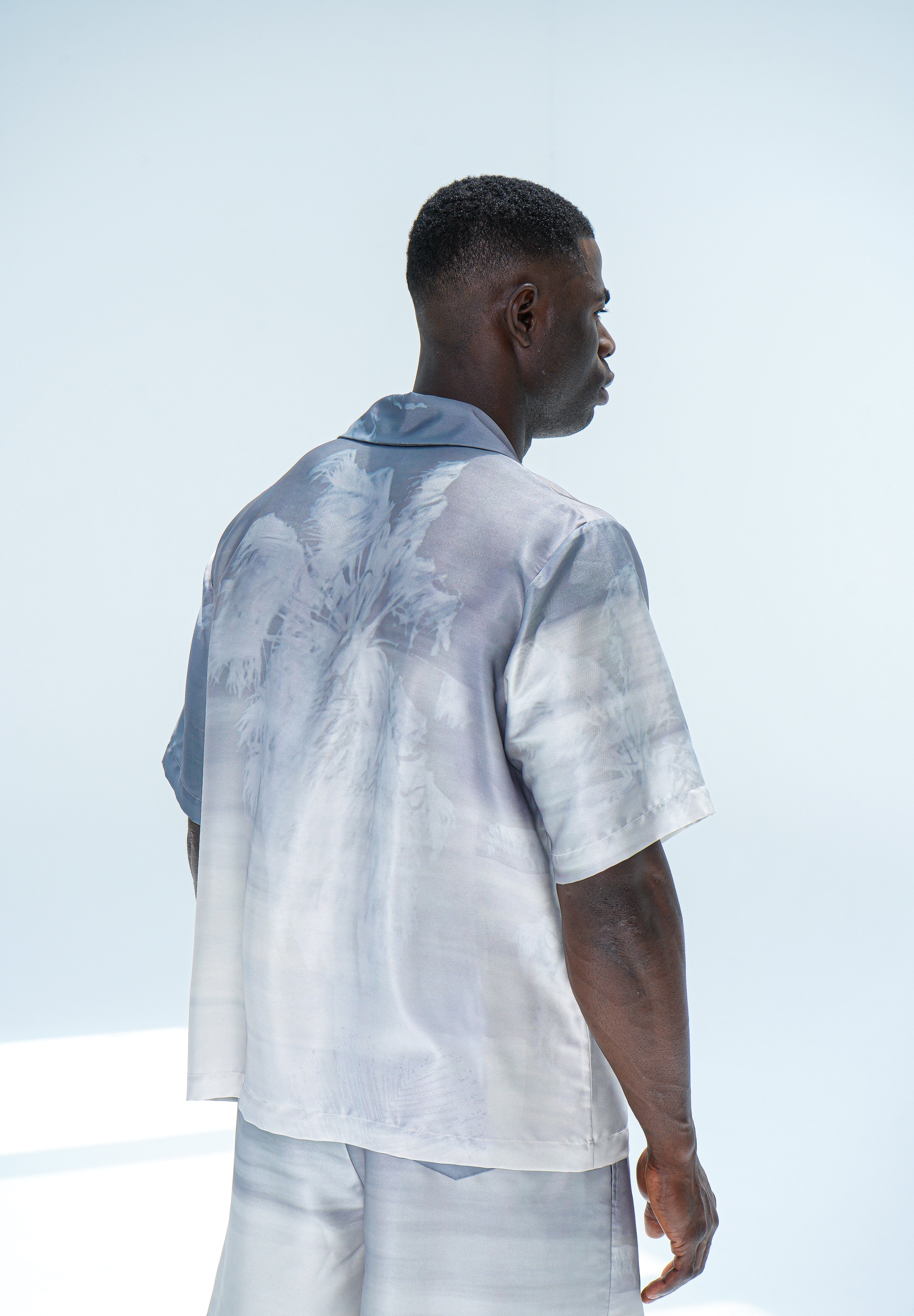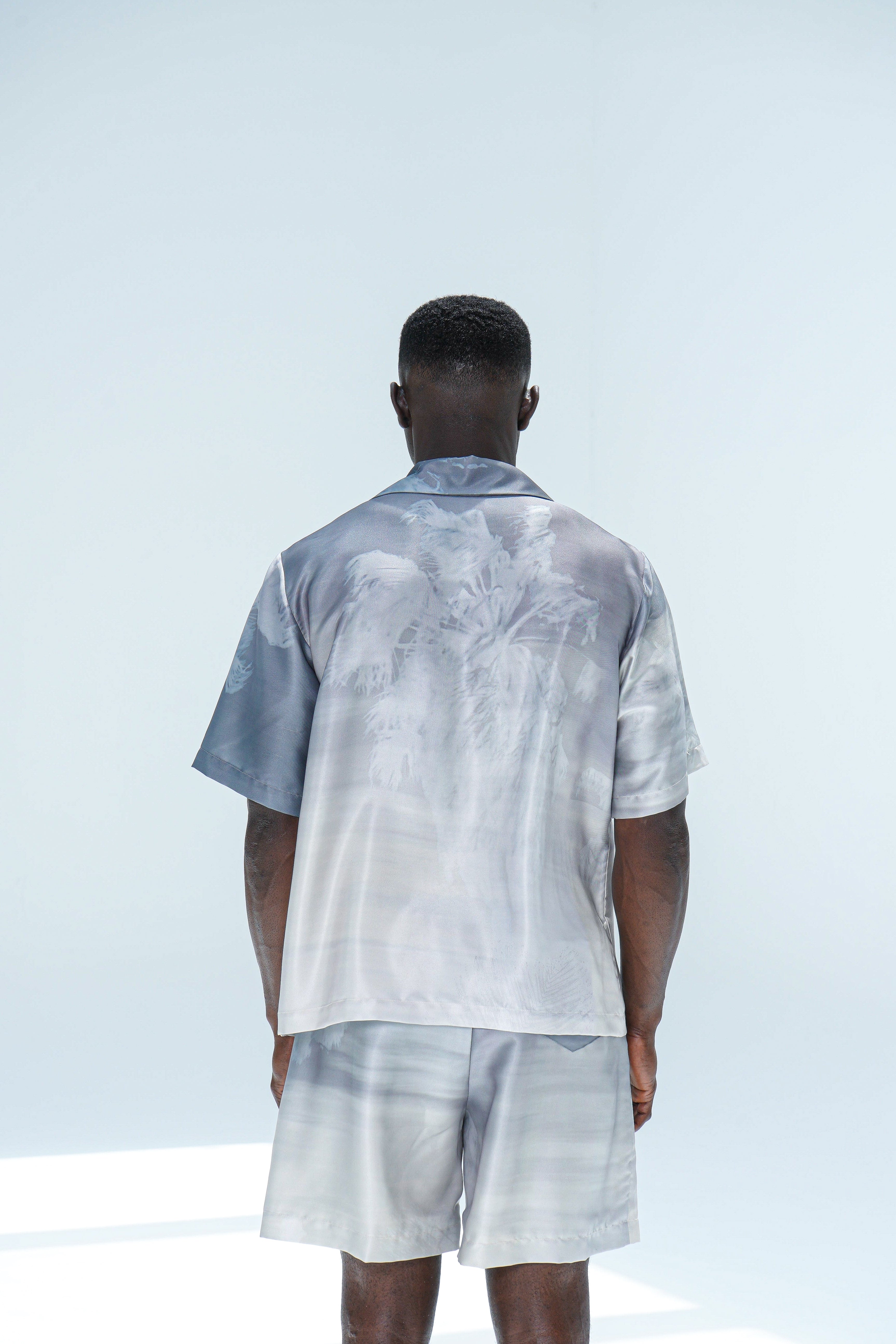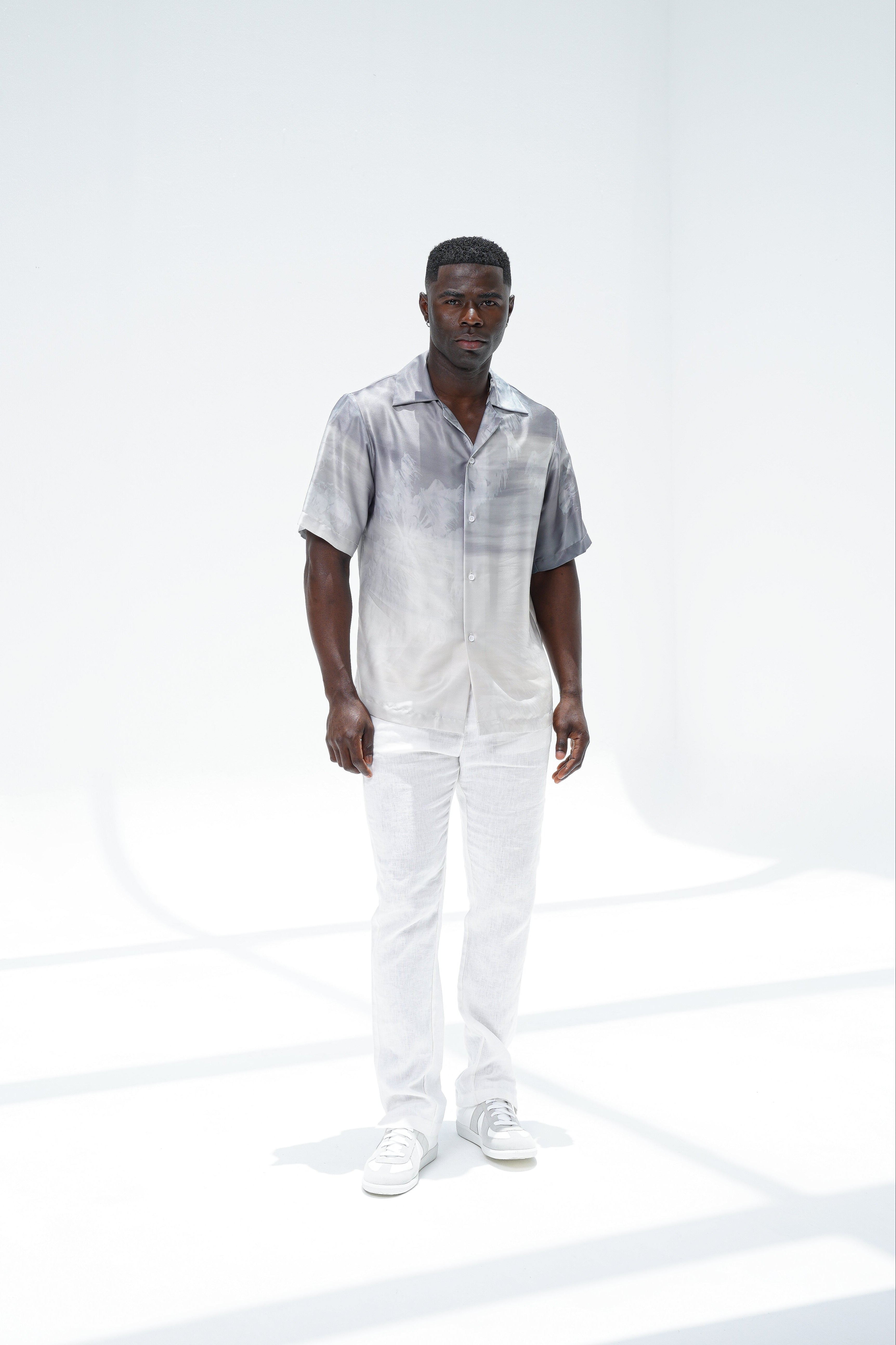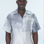 This relaxed piece features a suave Cuban collar and an abstract all-over graphic print, fading from an azure blue into a calming stone hue. Rendered in 100% rich polyester, offering a superior sheen and seamless drape.