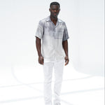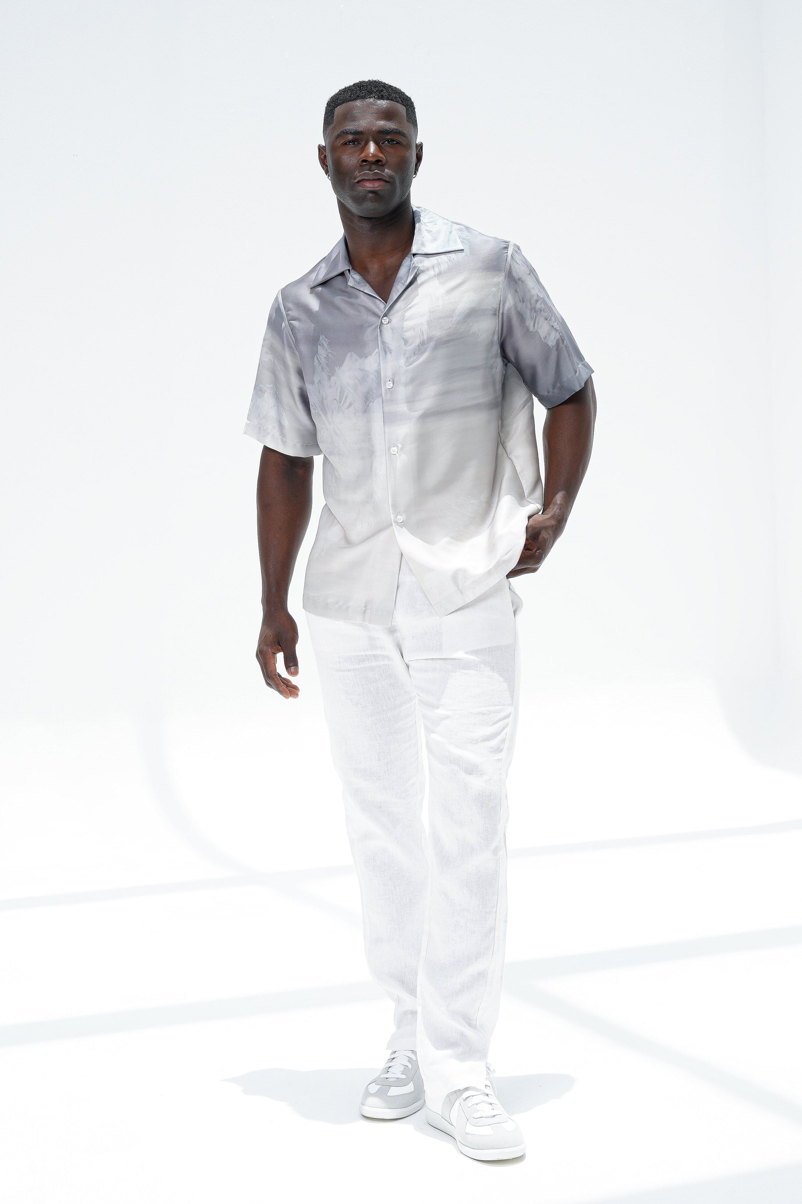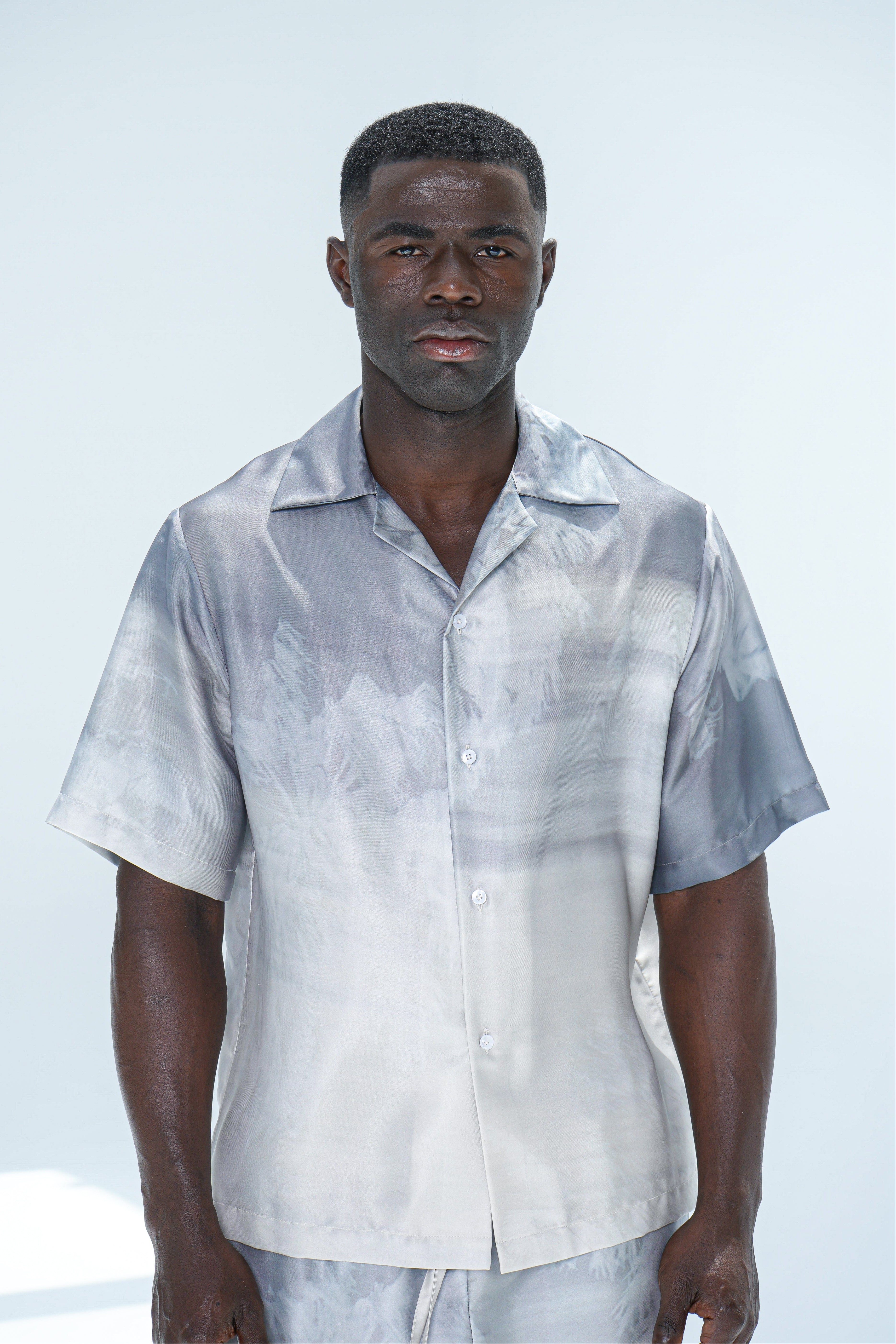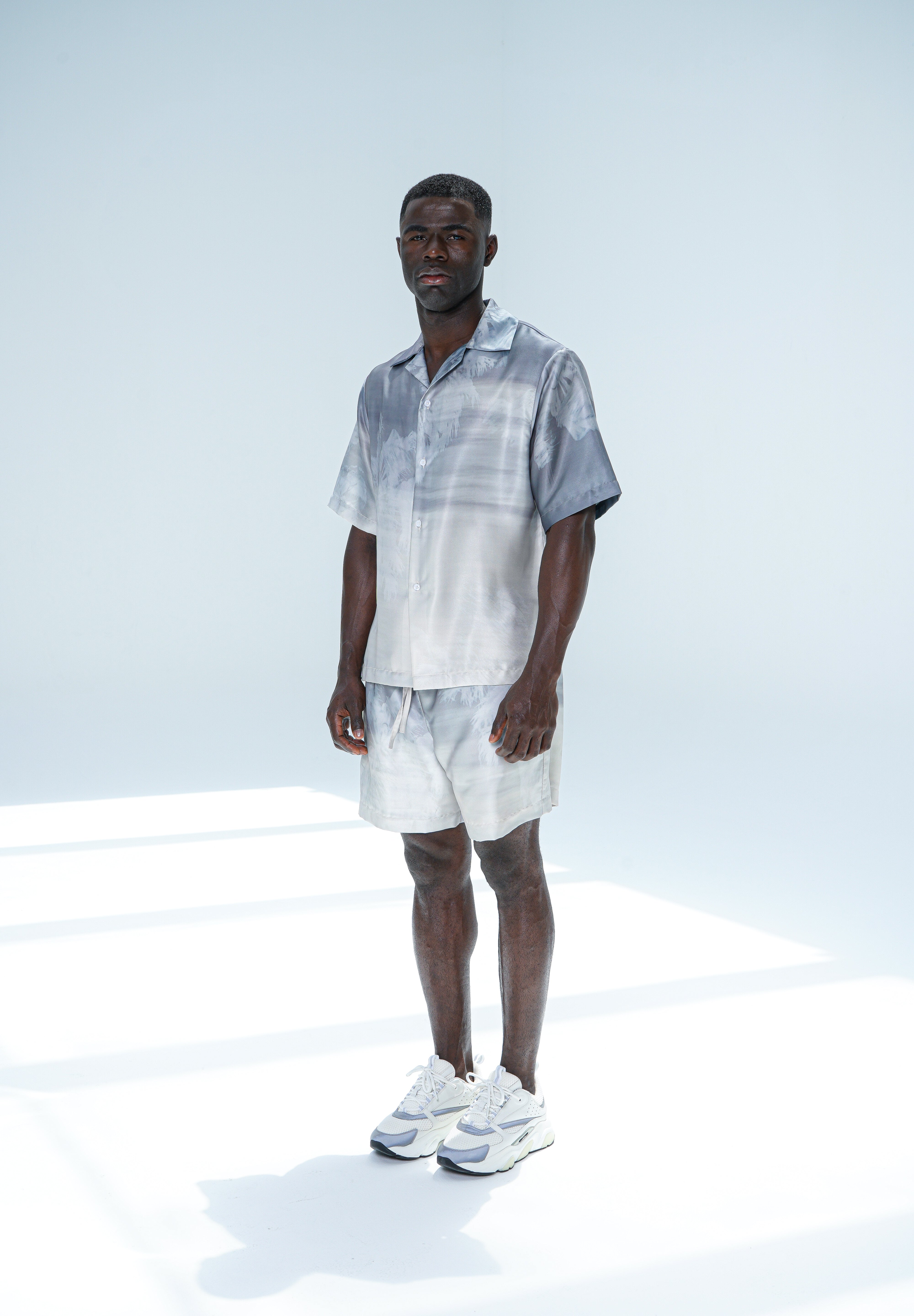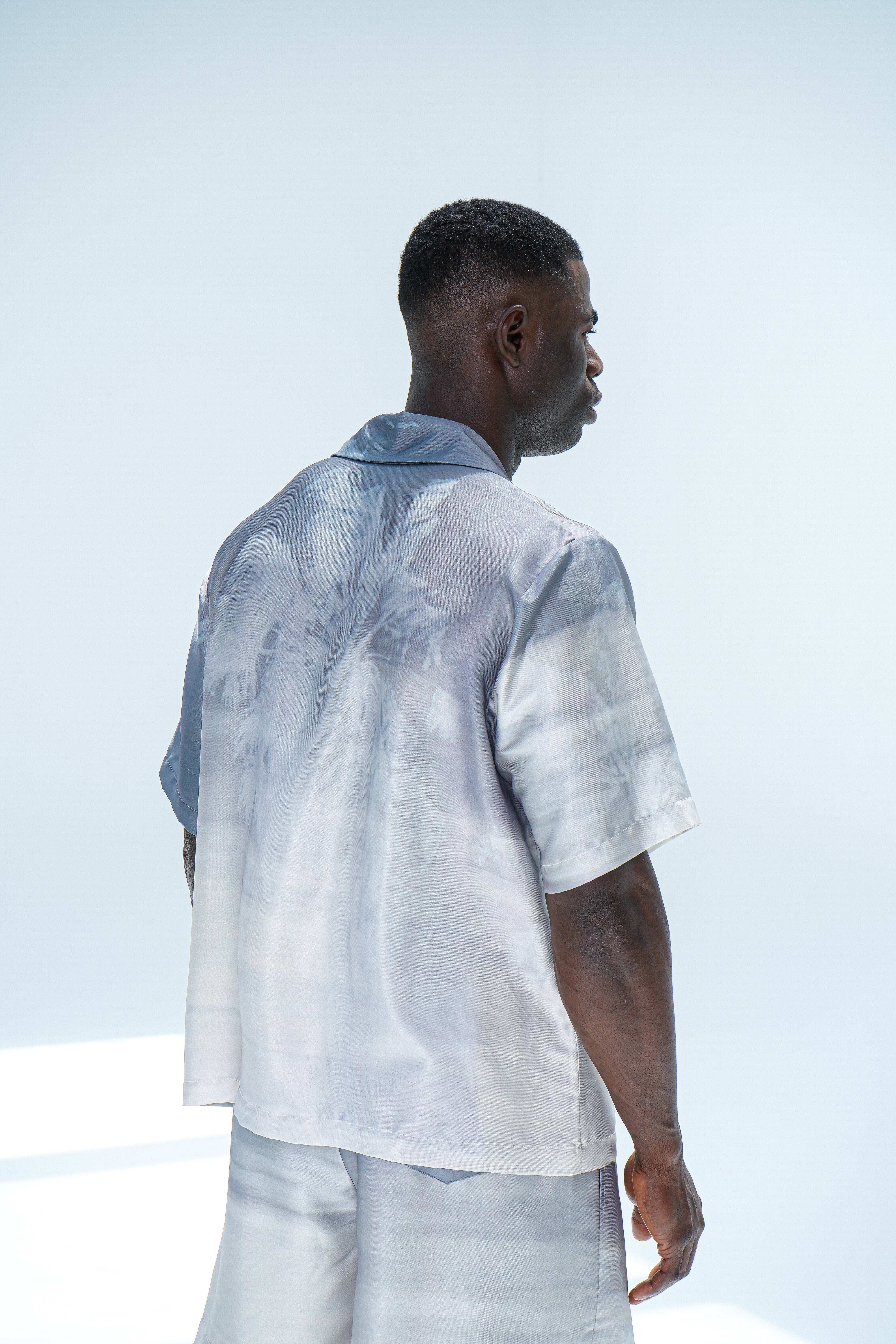 This relaxed piece features a suave Cuban collar and an abstract all-over graphic print, fading from an azure blue into a calming stone hue. Rendered in 100% rich polyester, offering a superior sheen and seamless drape.