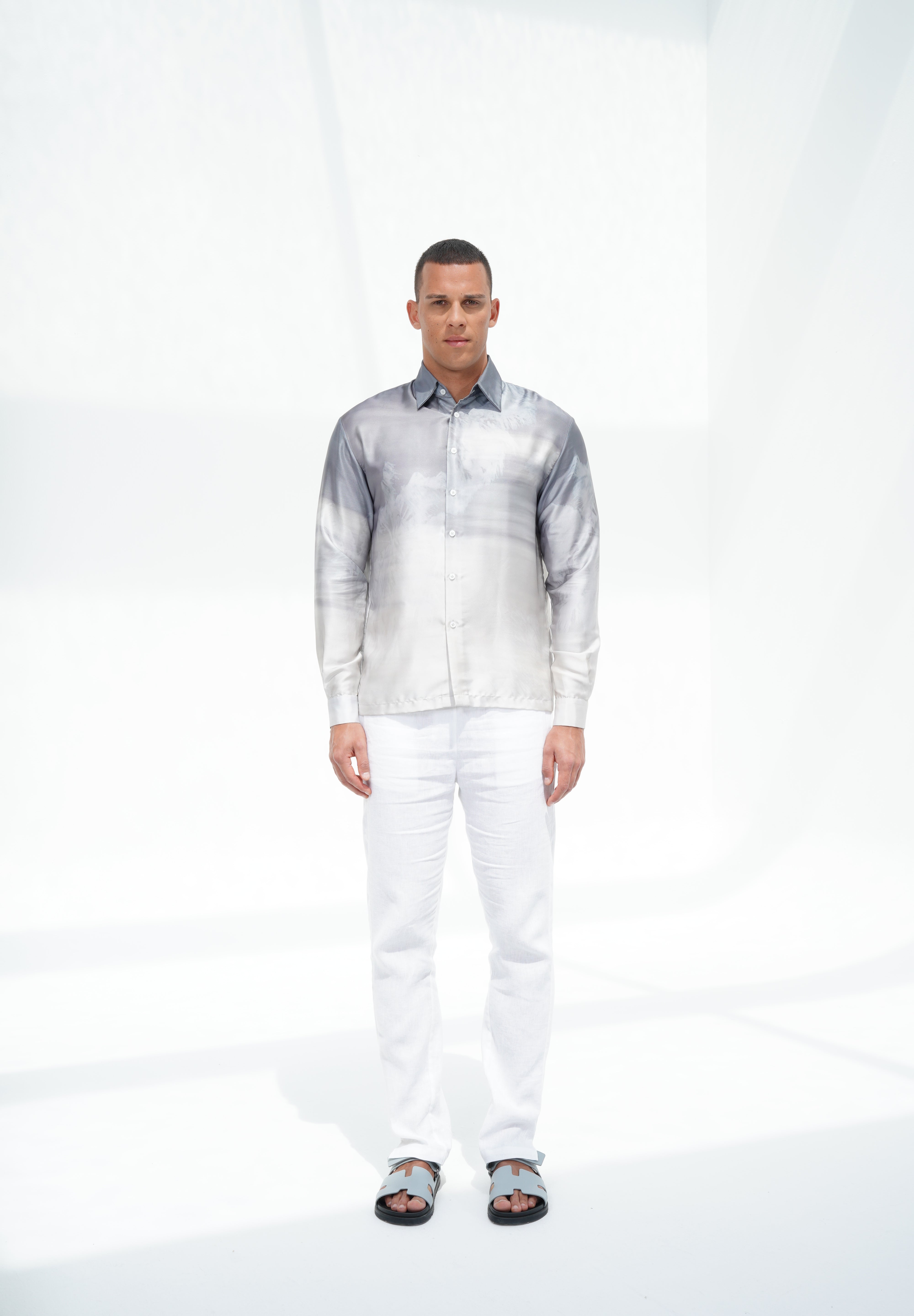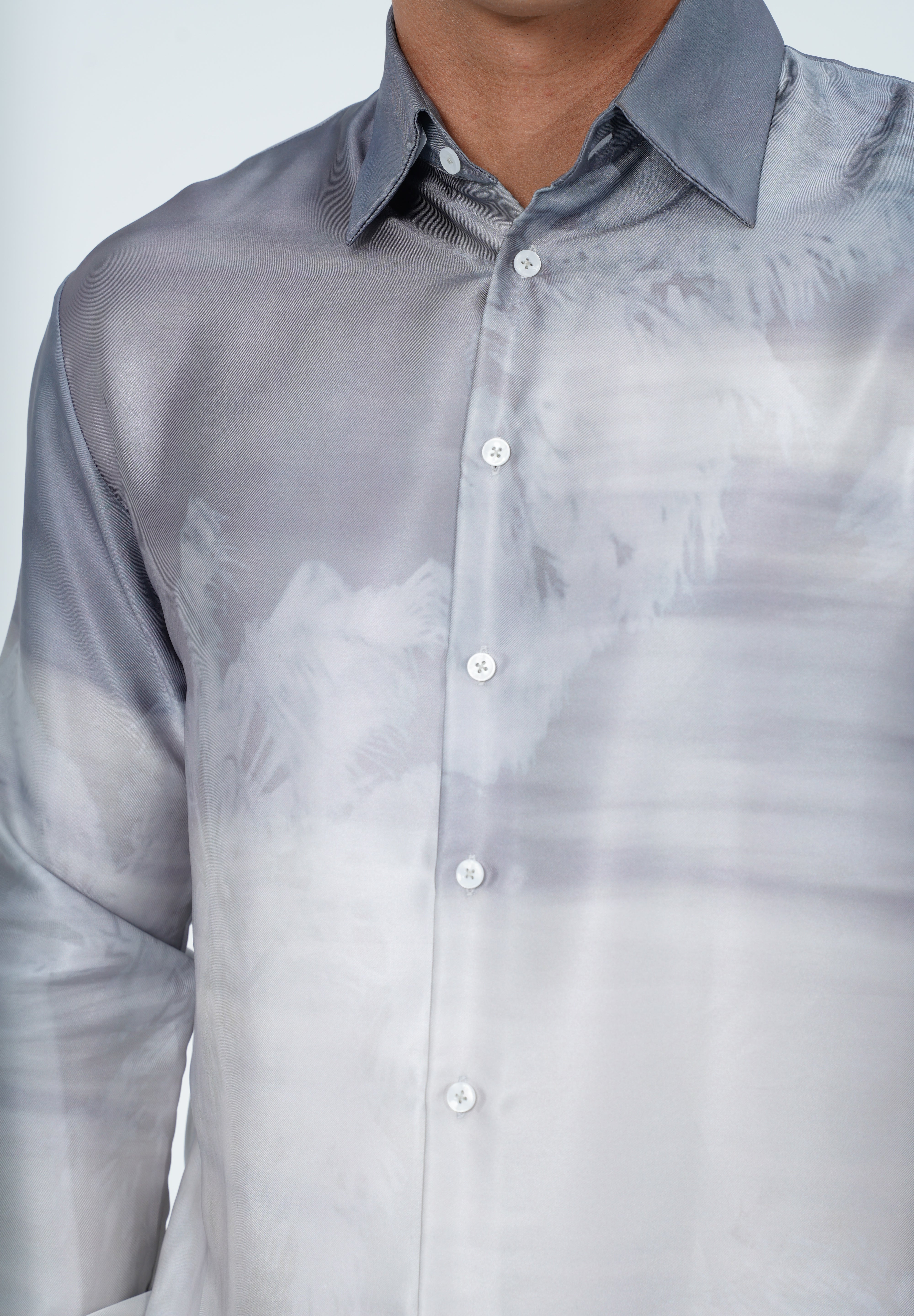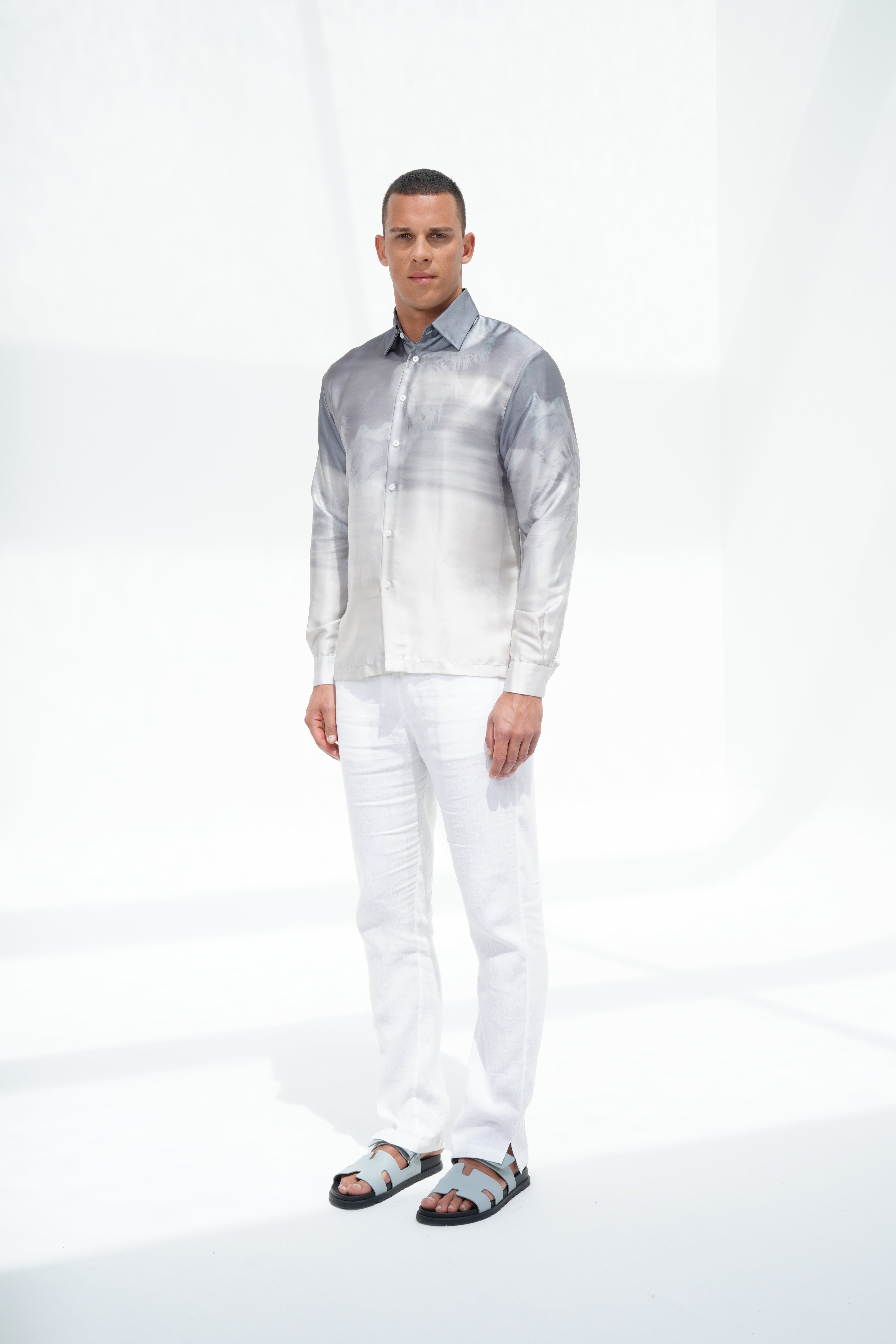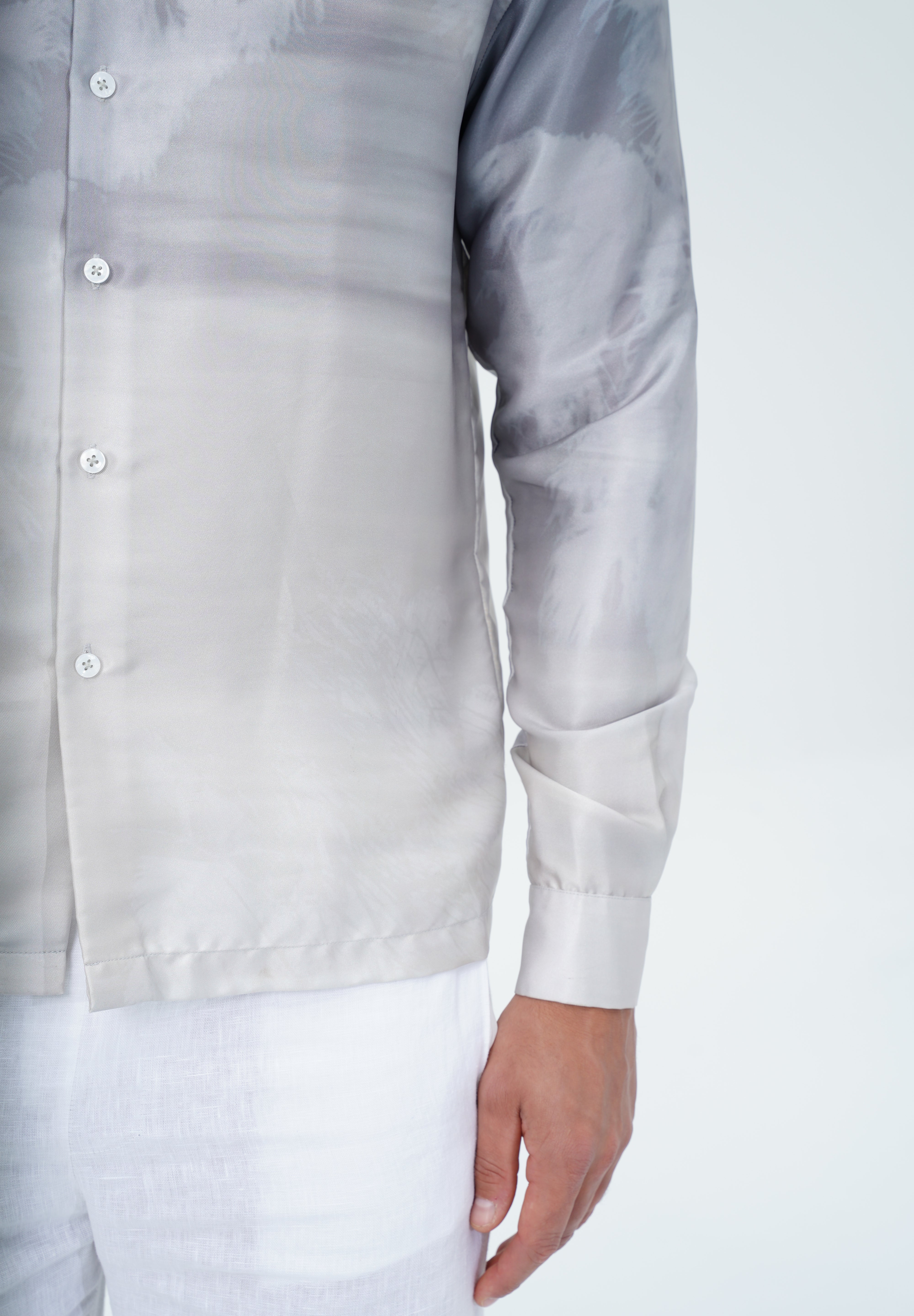 With long sleeves and a traditional collar, this relaxed piece features an abstract all-over graphic print, fading from an azure blue into a calming stone hue. Rendered in 100% rich polyester, offering a superior sheen and seamless drape.