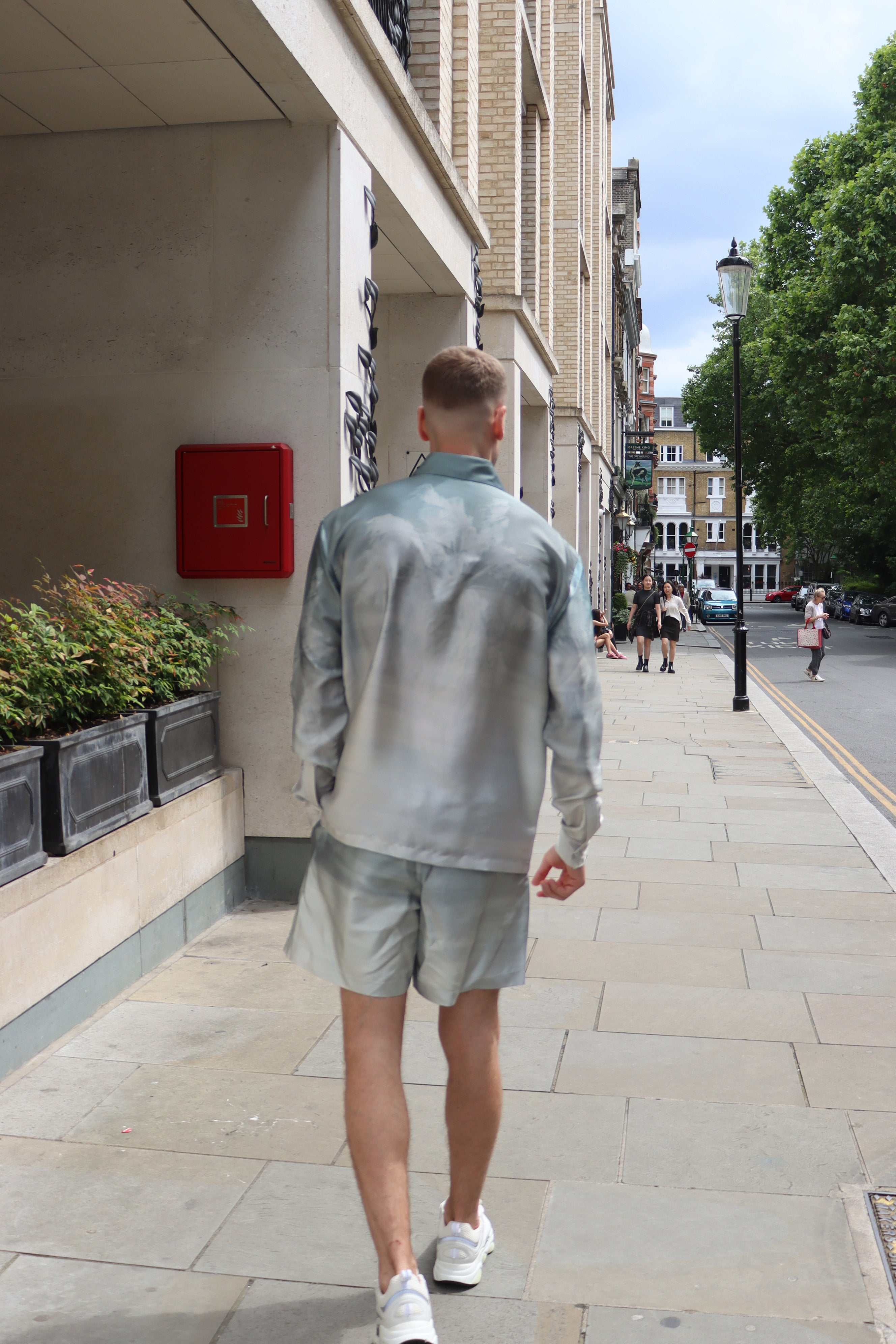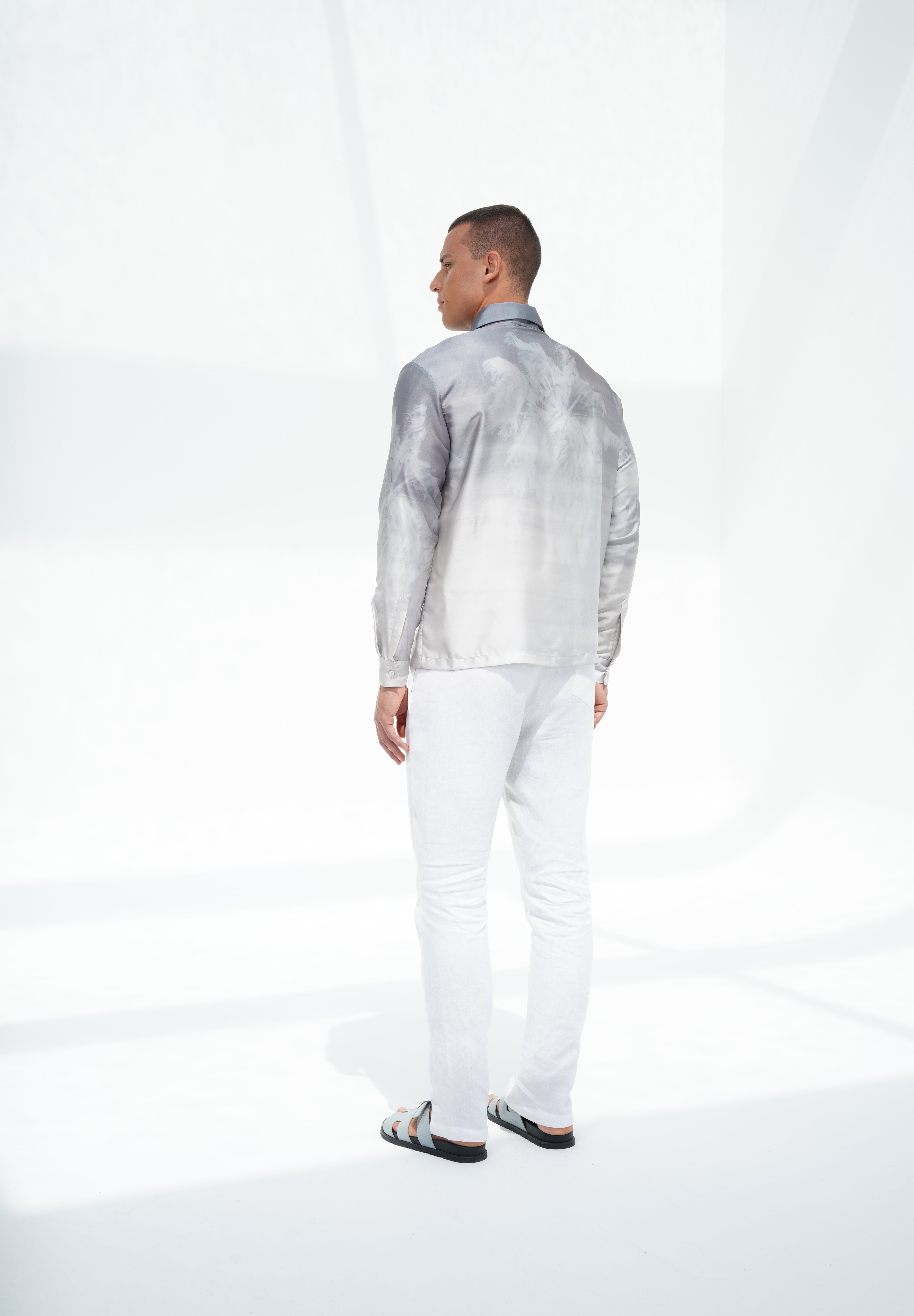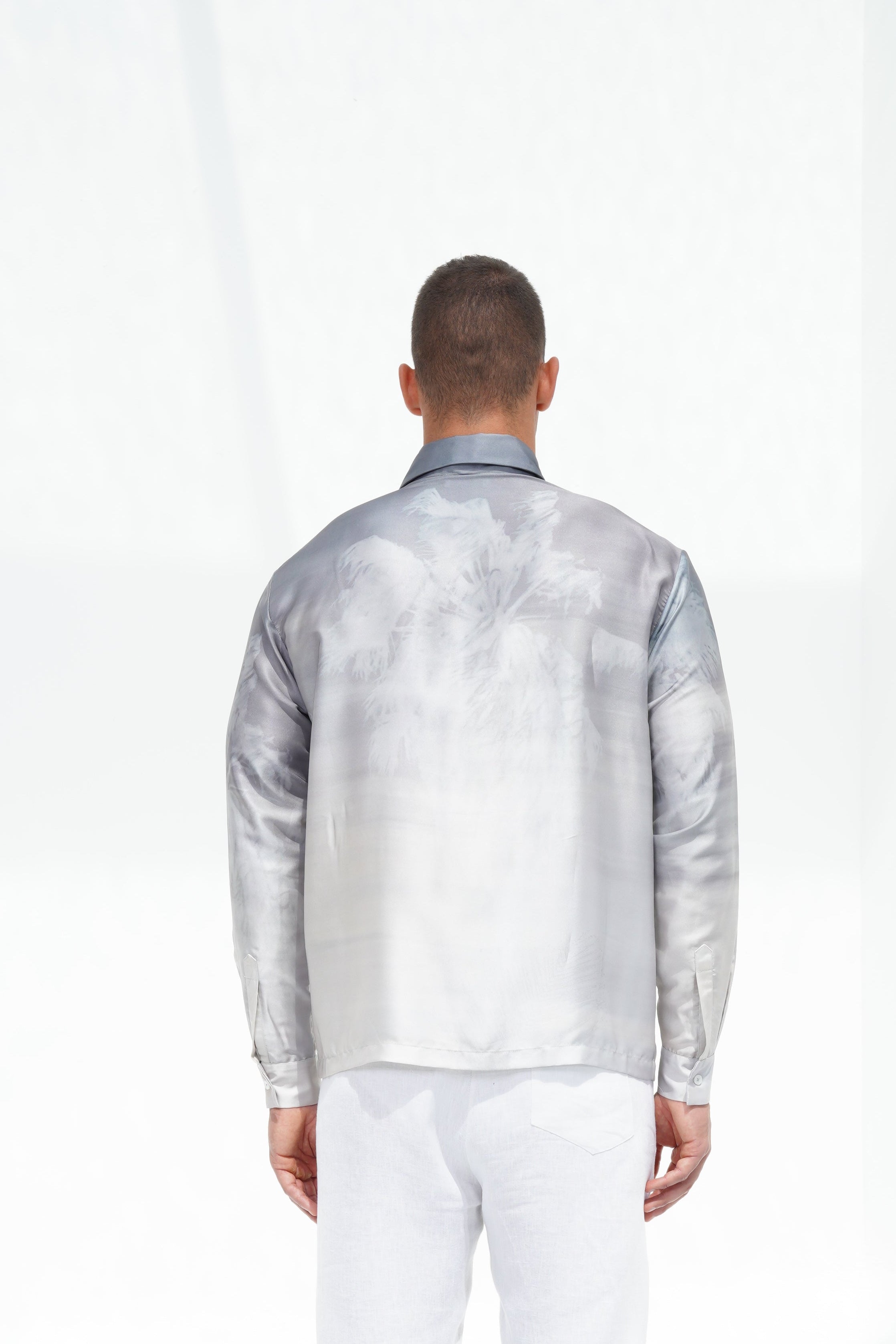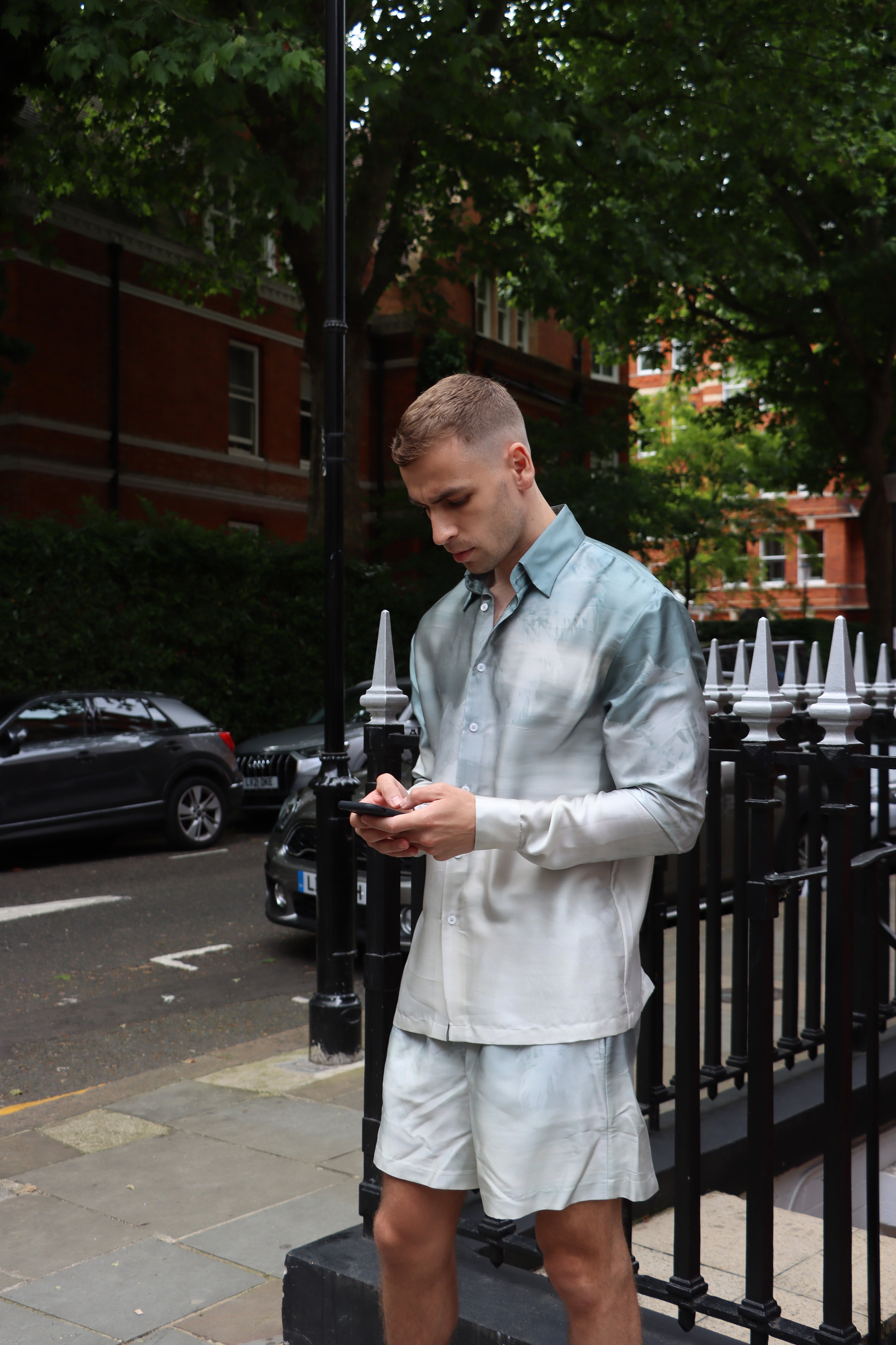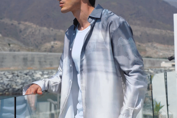 With long sleeves and a traditional collar, this relaxed piece features an abstract all-over graphic print, fading from an azure blue into a calming stone hue. Rendered in 100% rich polyester, offering a superior sheen and seamless drape.