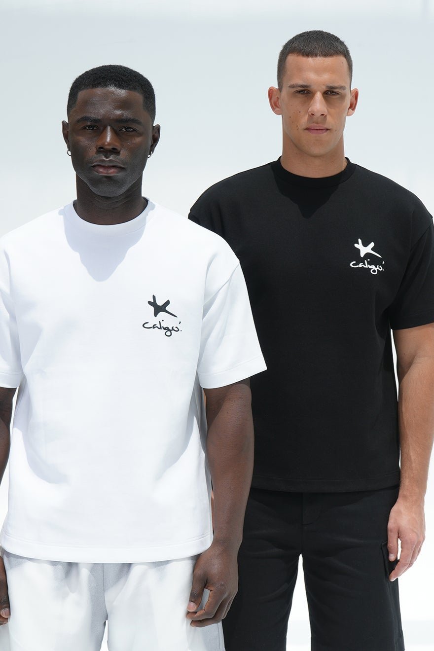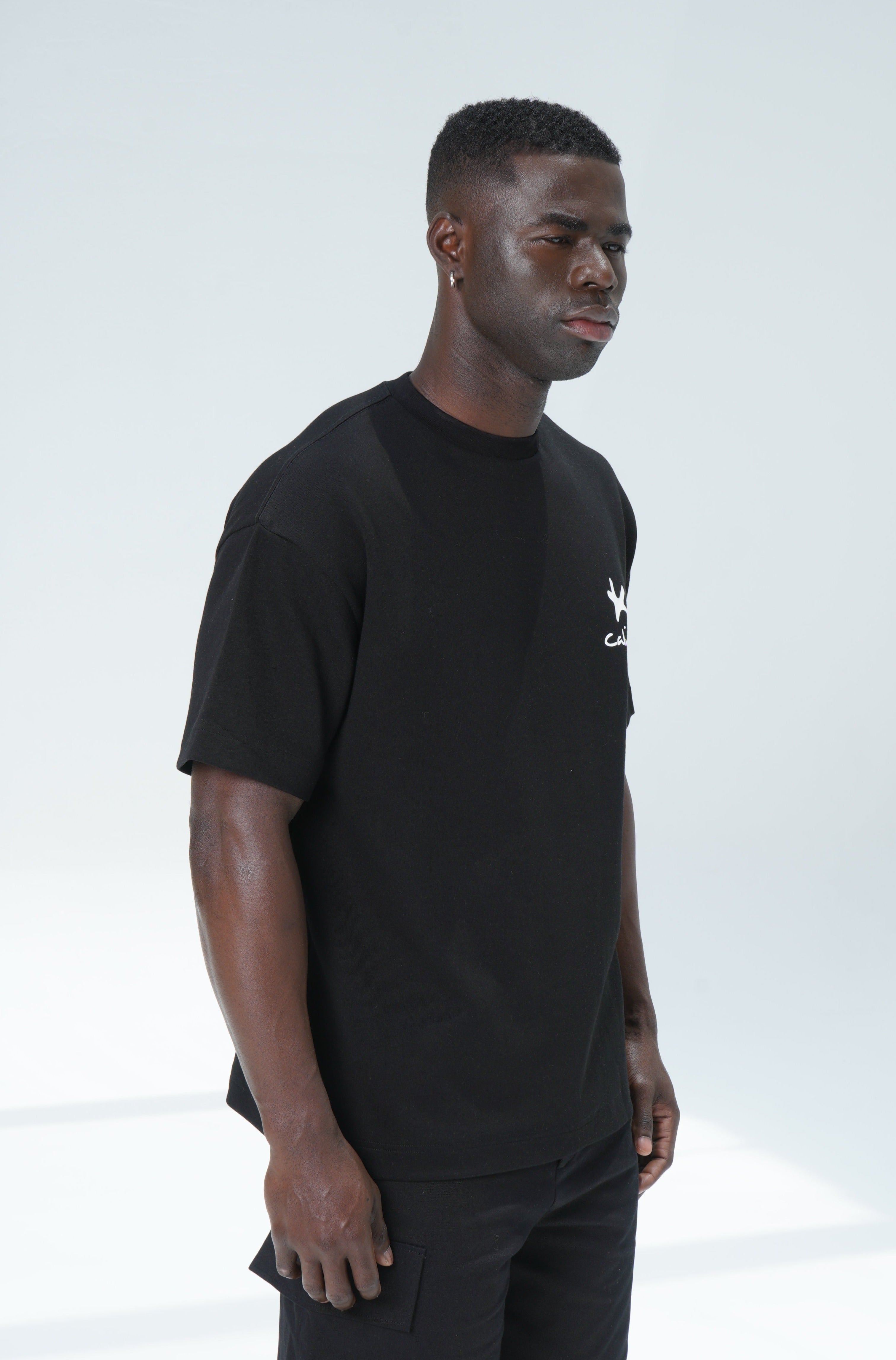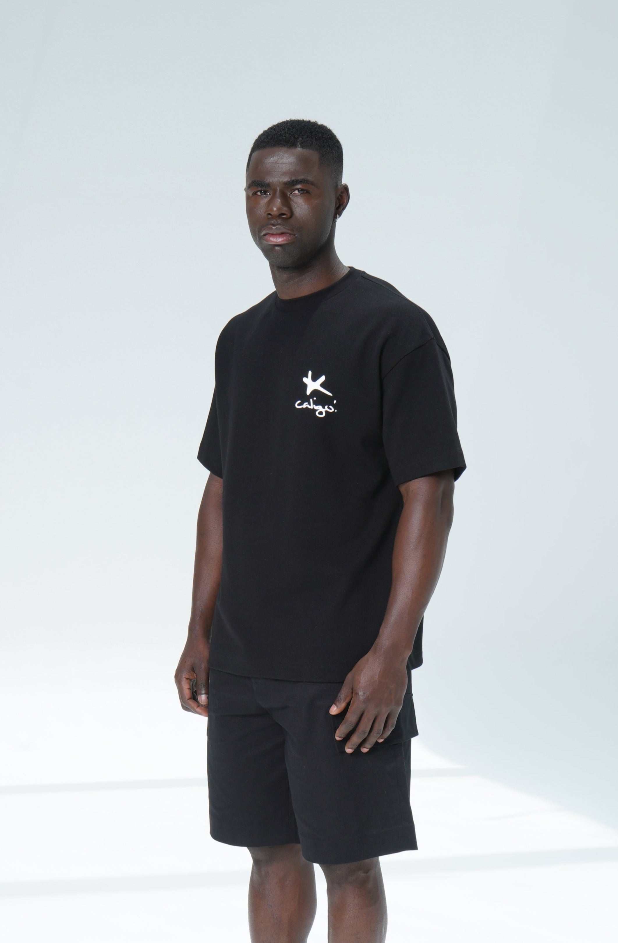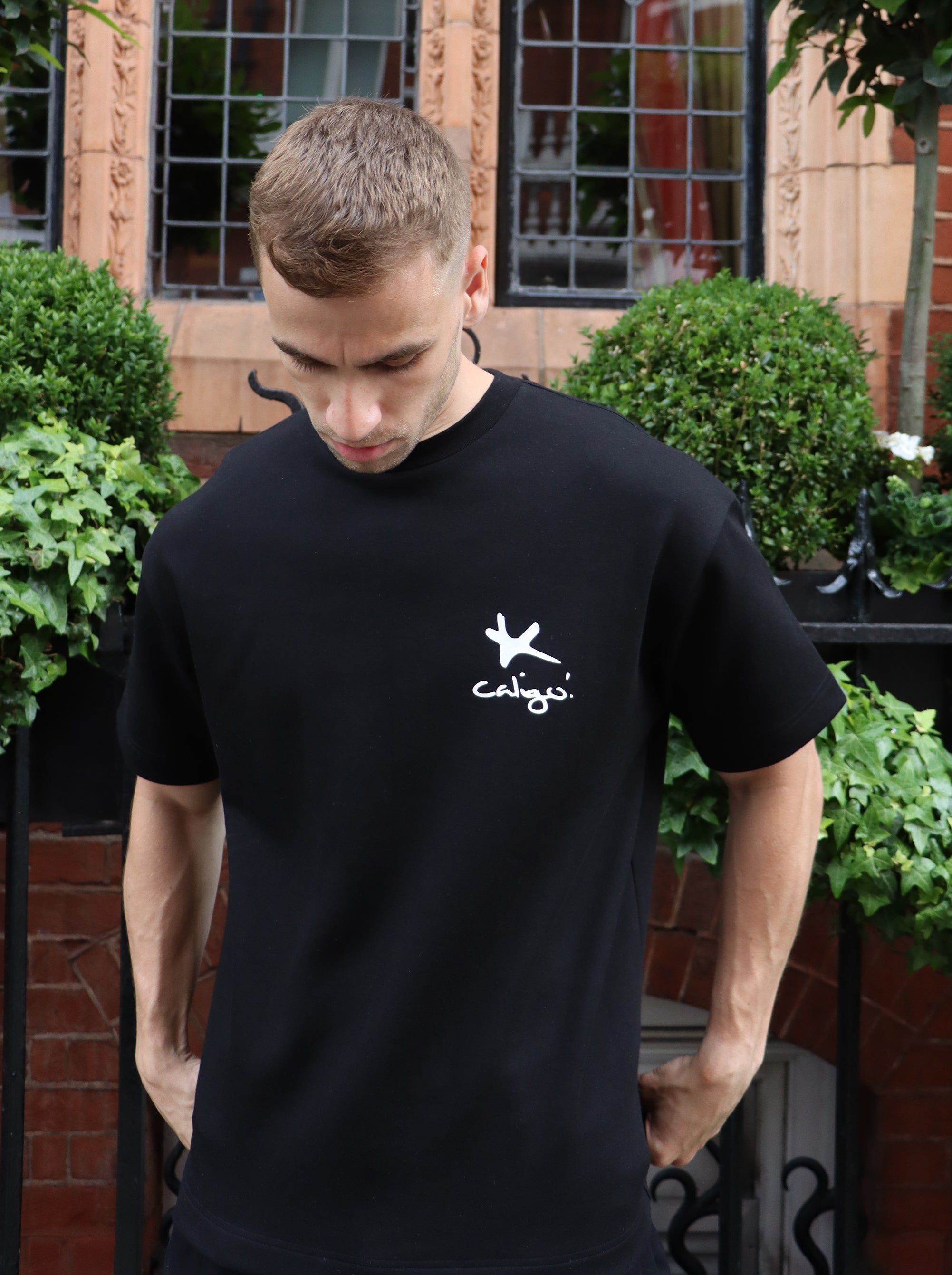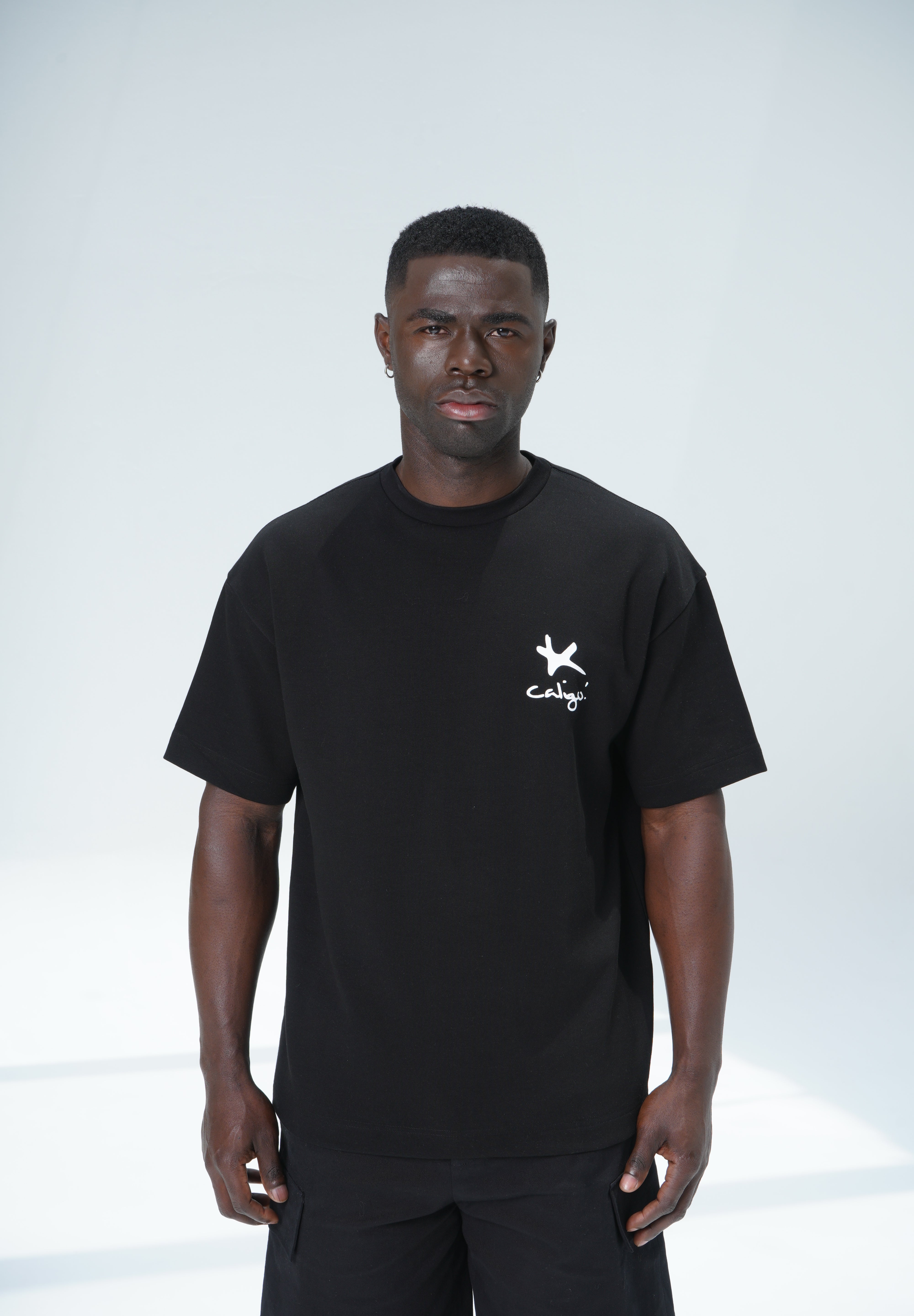 Crafted from heavyweight 280gsm 100% cotton, this black t-shirt combines comfort with distinctive style. Featuring the CALIGO graphic text and a star emblem on the left breast, it offers a clean, crisp look.