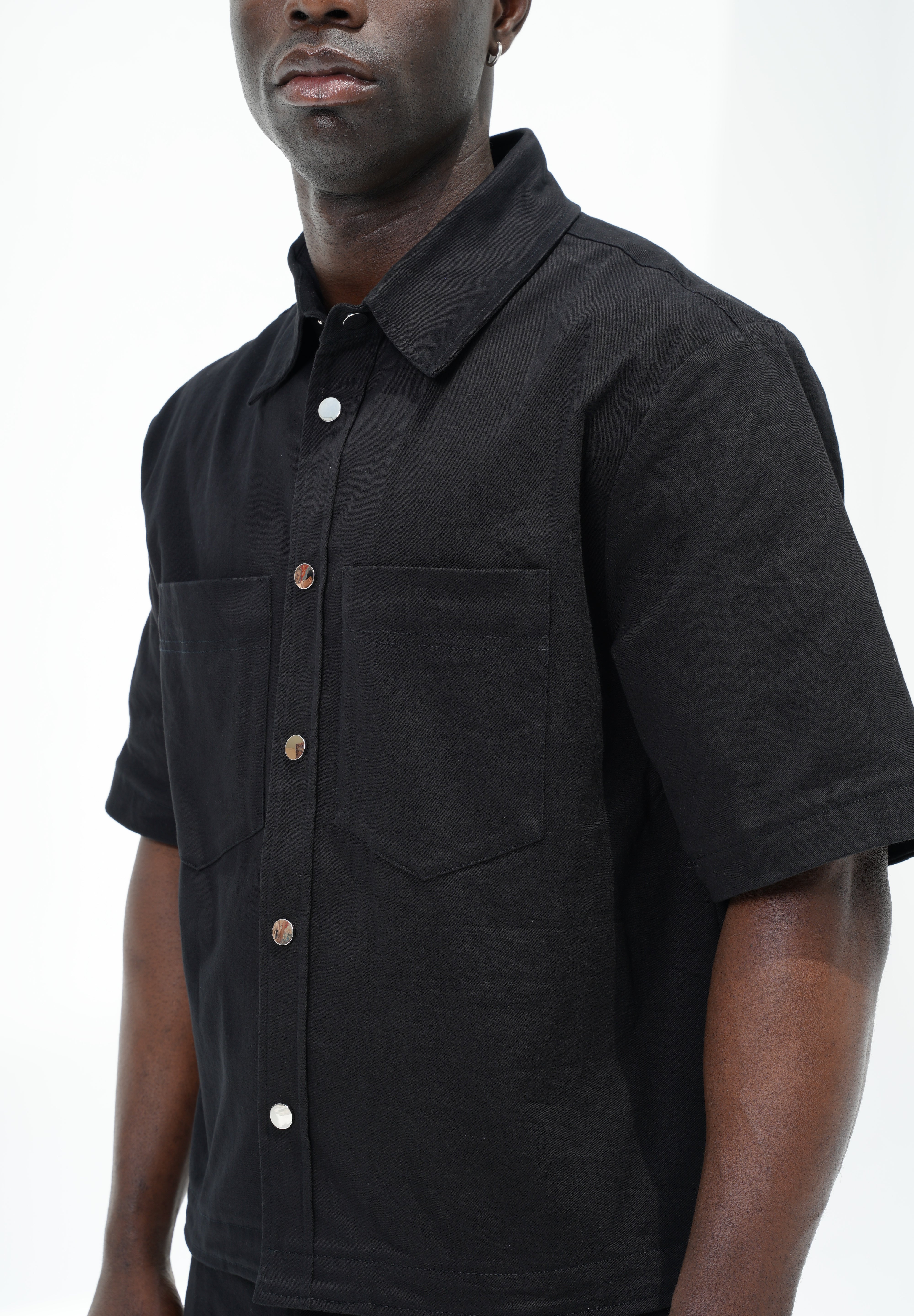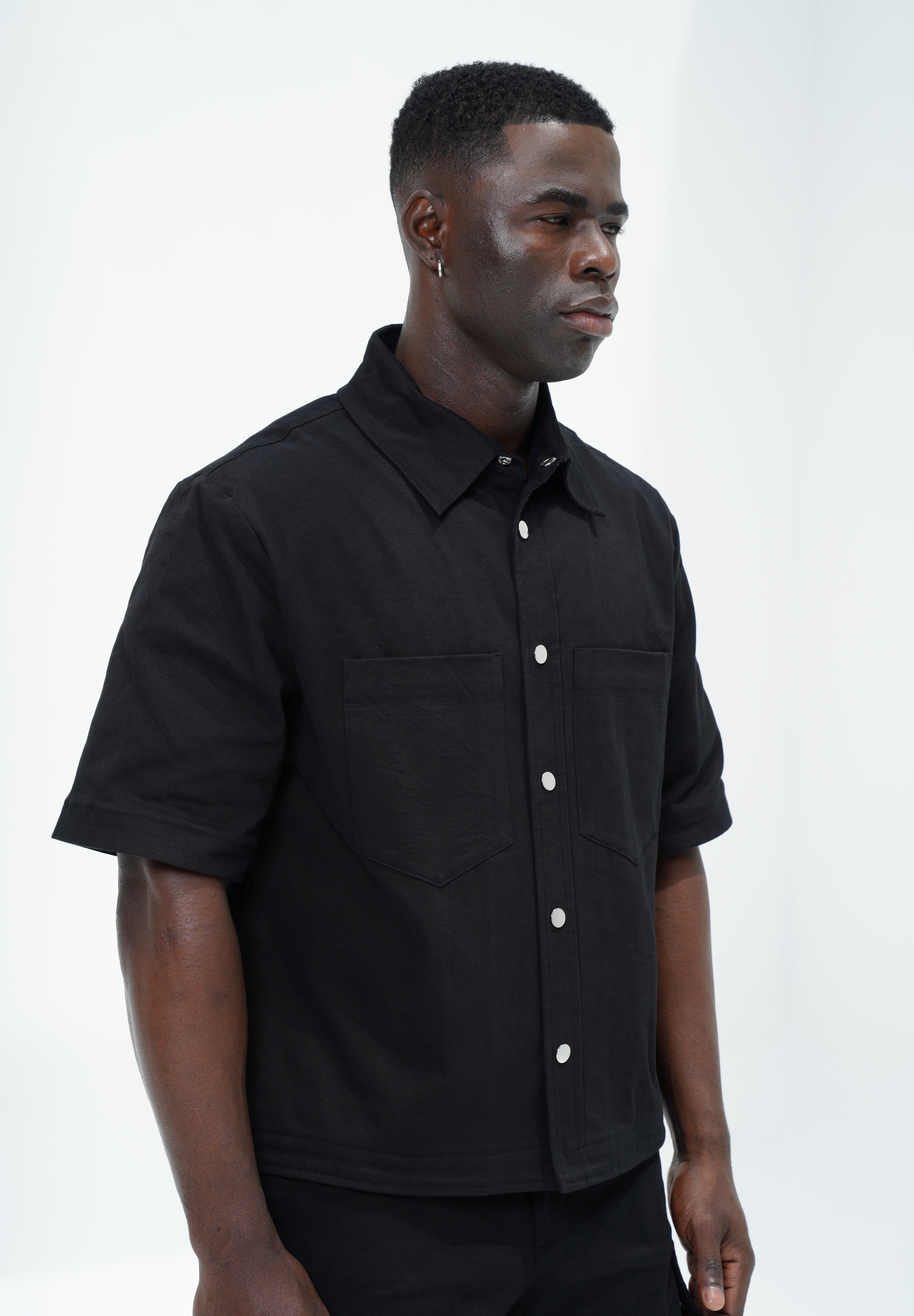 Crafted from 270gsm cotton denim, this black overshirt is designed with a boxy fit, secured with sleek metal clasp buttons and includes two breast pockets. It features a clean, structured silhouette that makes a bold statement.