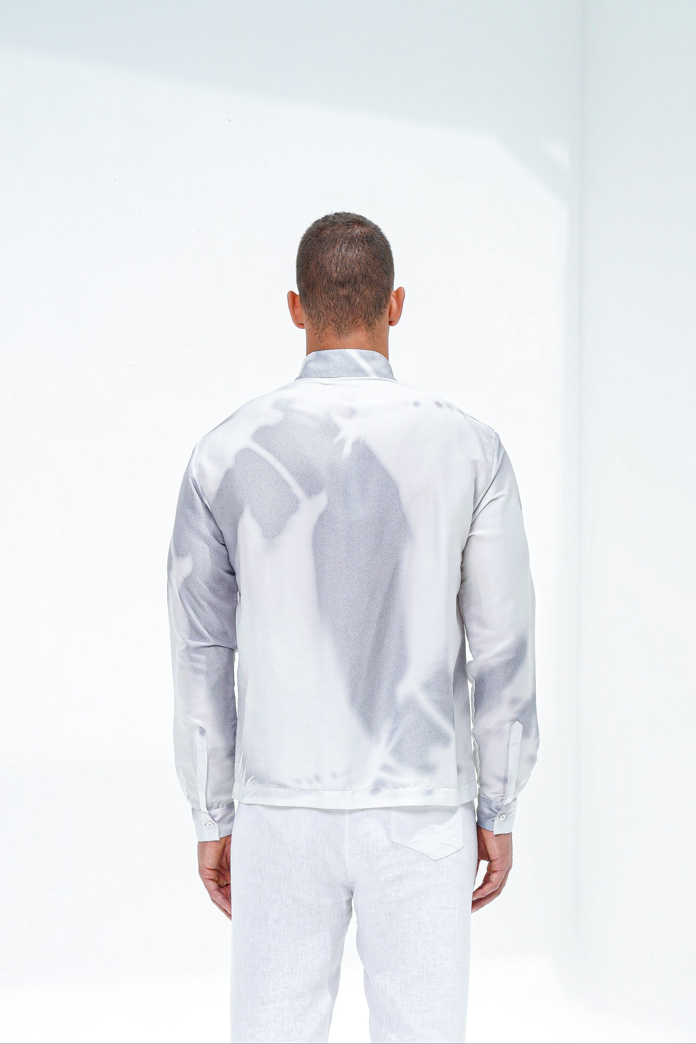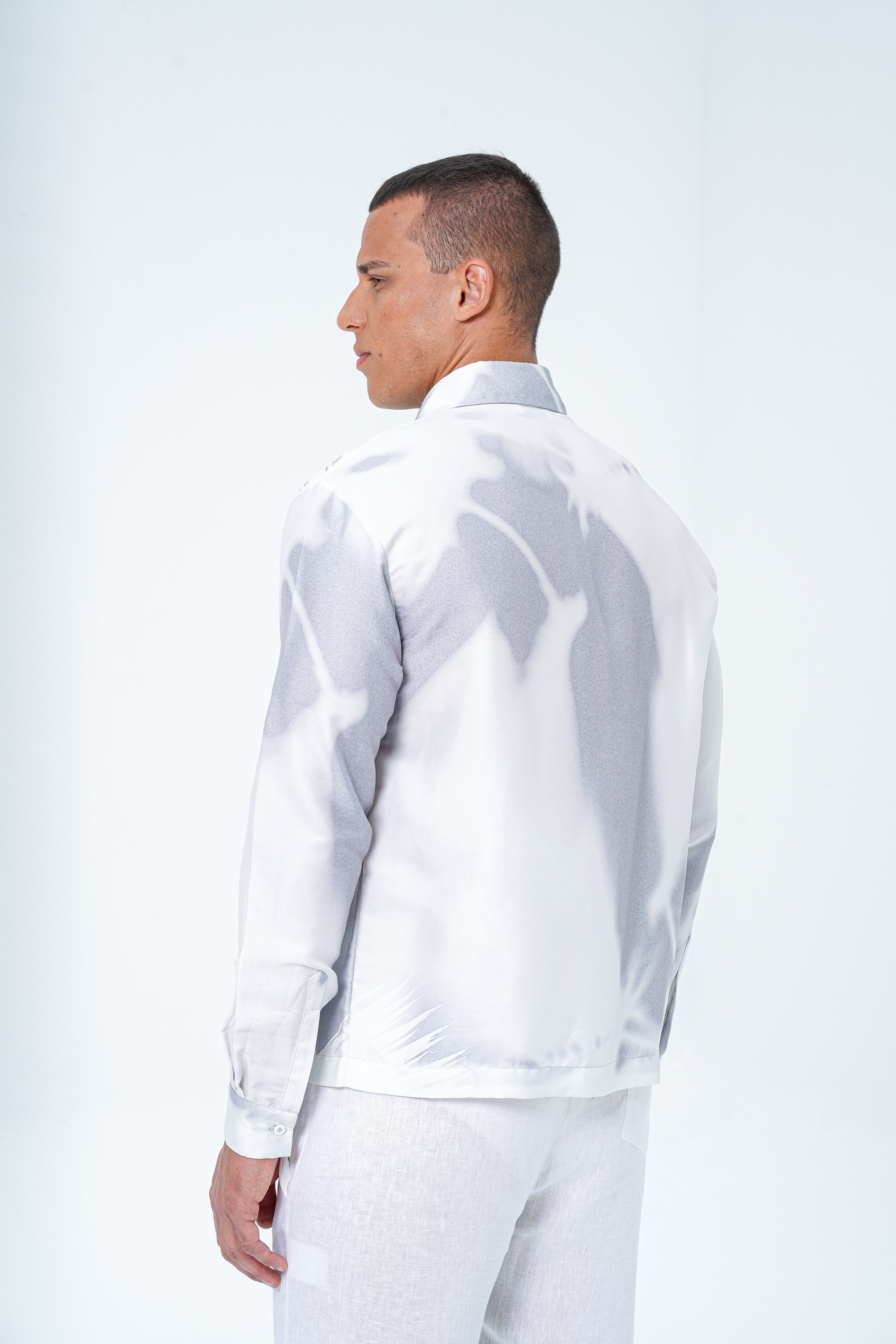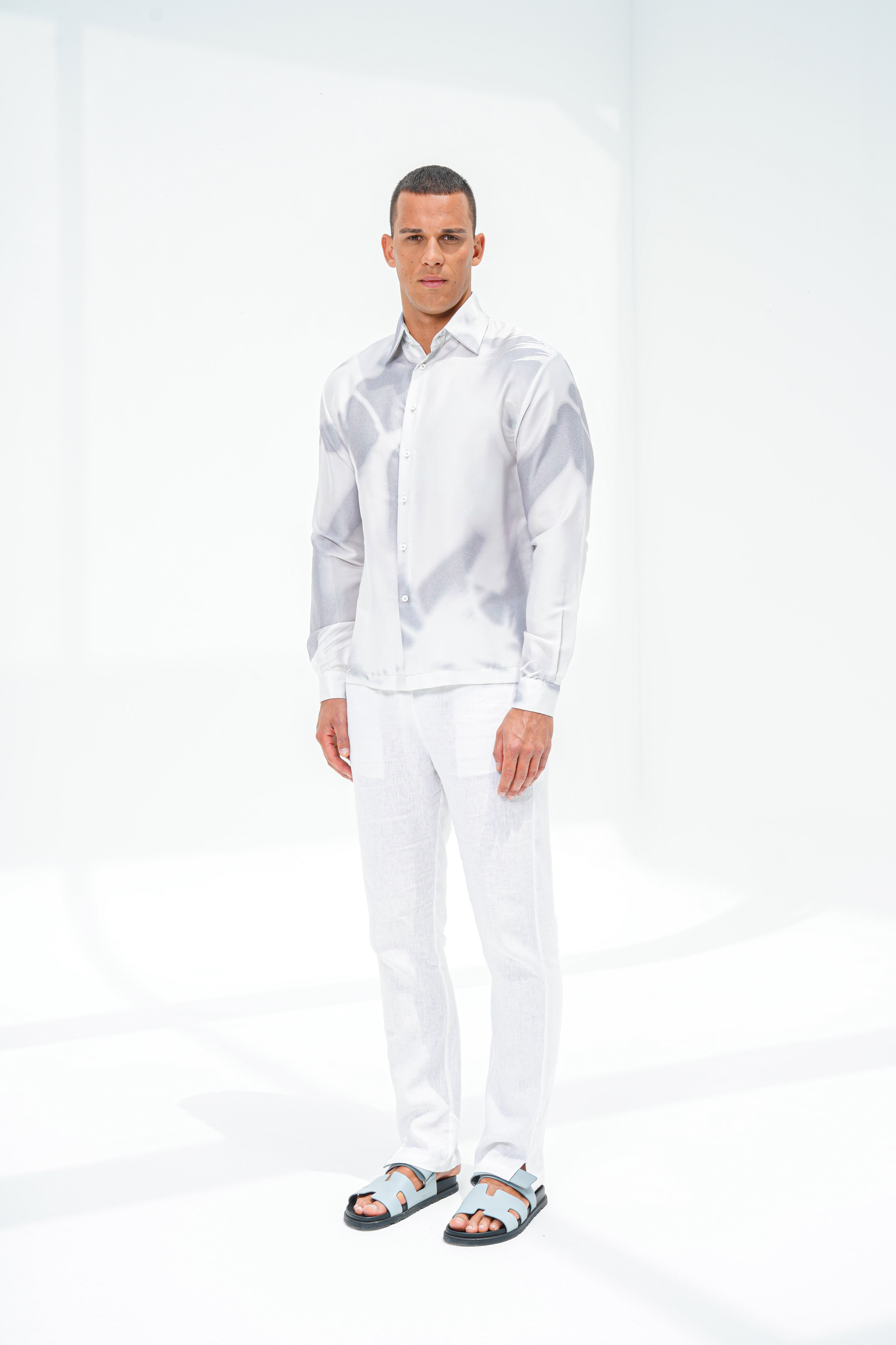 With long sleeves and a traditional collar, this relaxed piece features an abstract all-over graphic print on a satin white base with abstract hues of a subtle azure grey. Rendered in 100% rich polyester, offering a superior sheen and seamless drape.