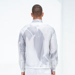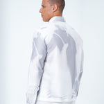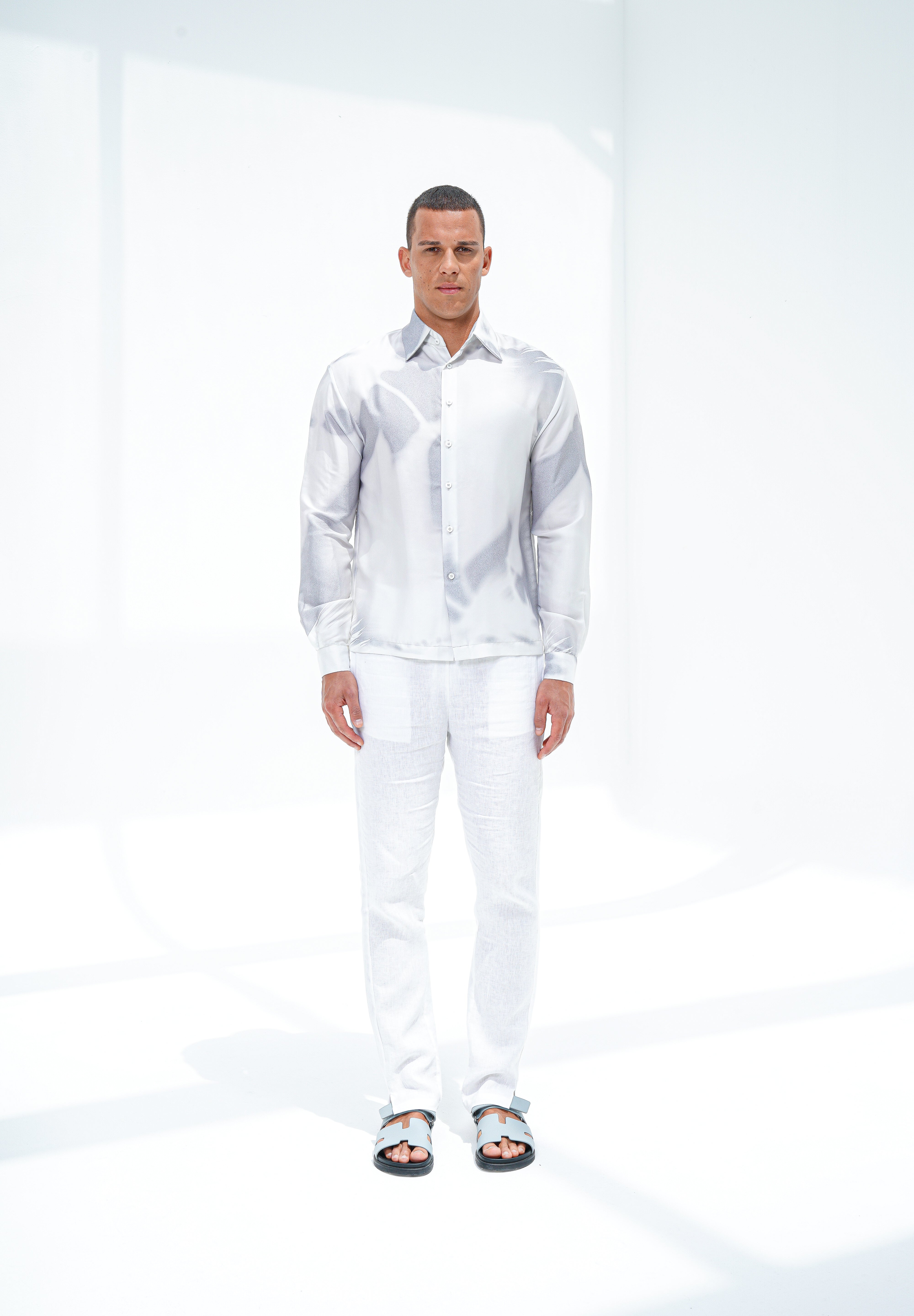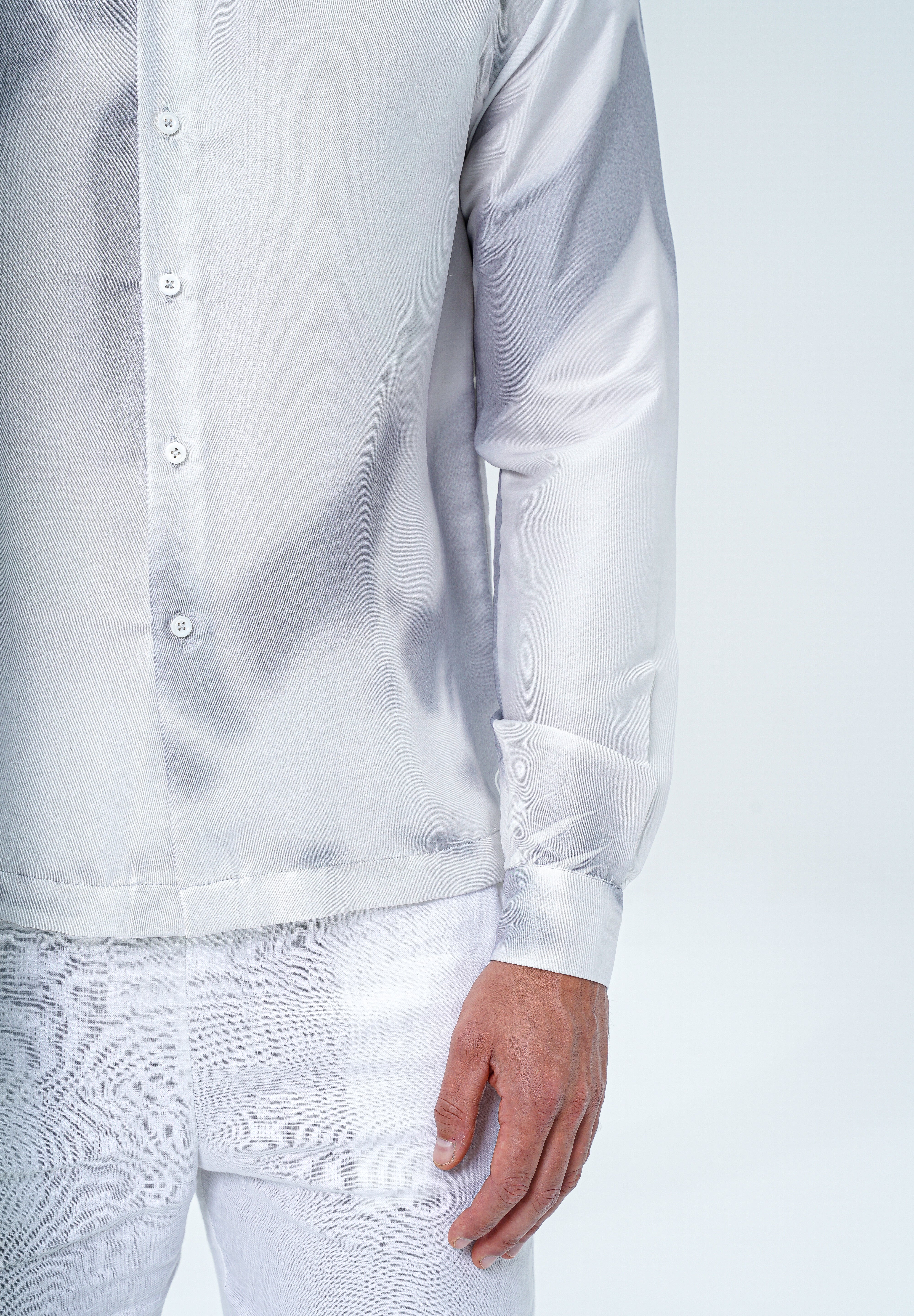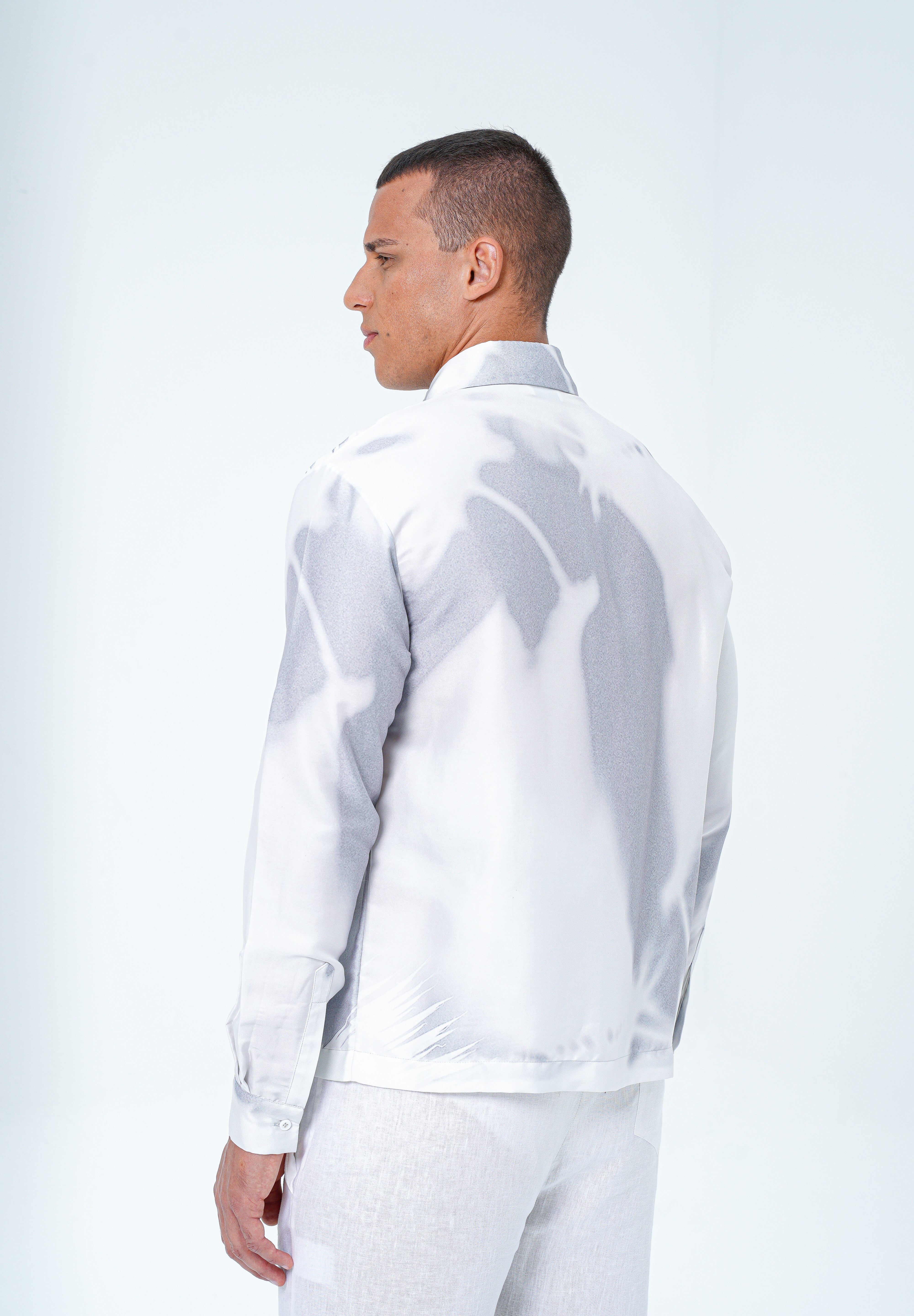 With long sleeves and a traditional collar, this relaxed piece features an abstract all-over graphic print on a satin white base with abstract hues of a subtle azure grey. Rendered in 100% rich polyester, offering a superior sheen and seamless drape.