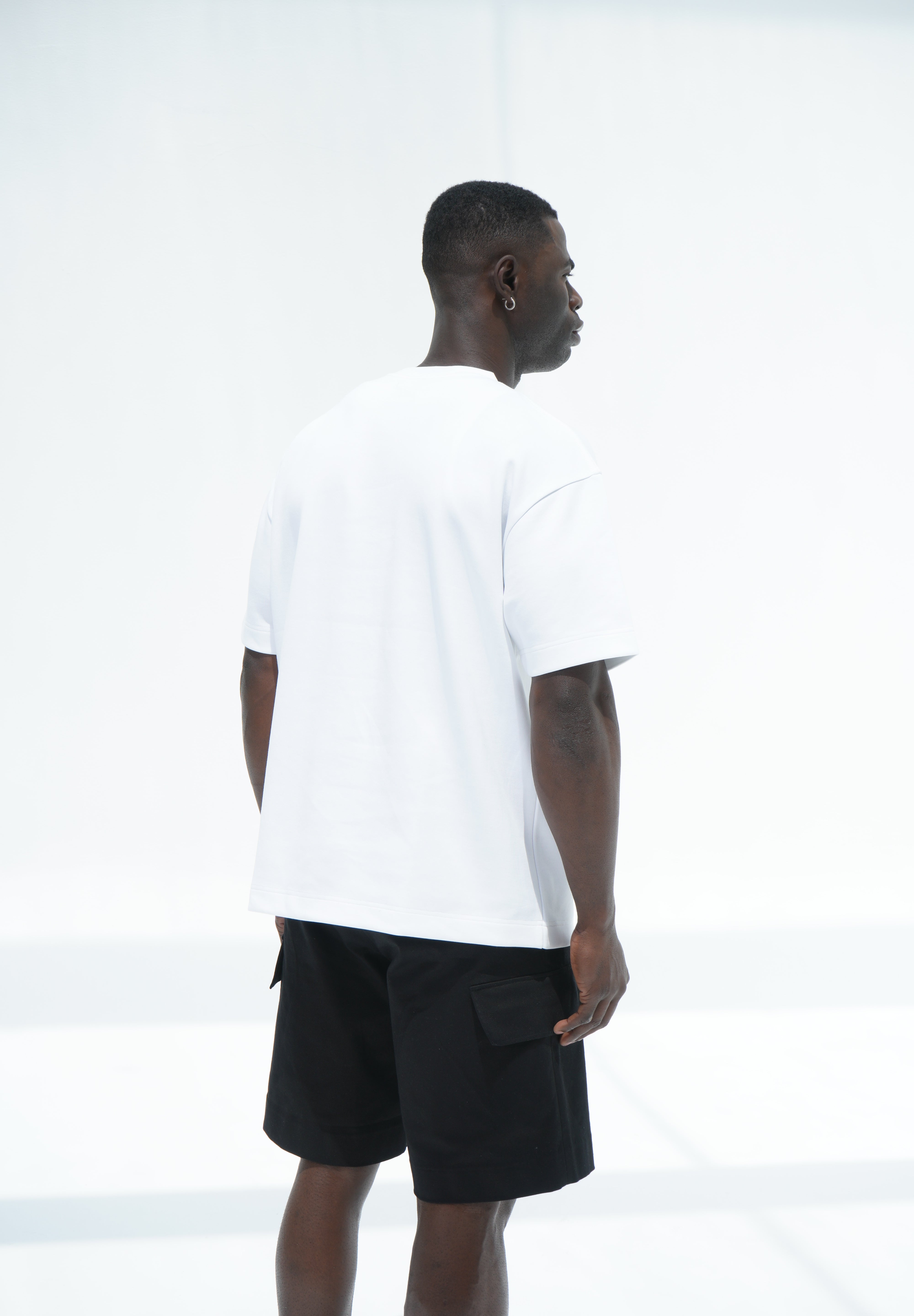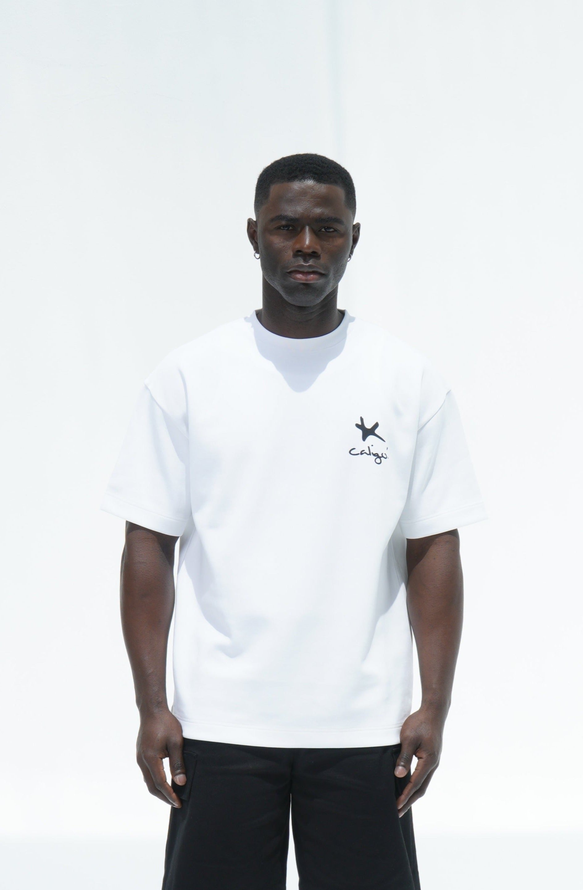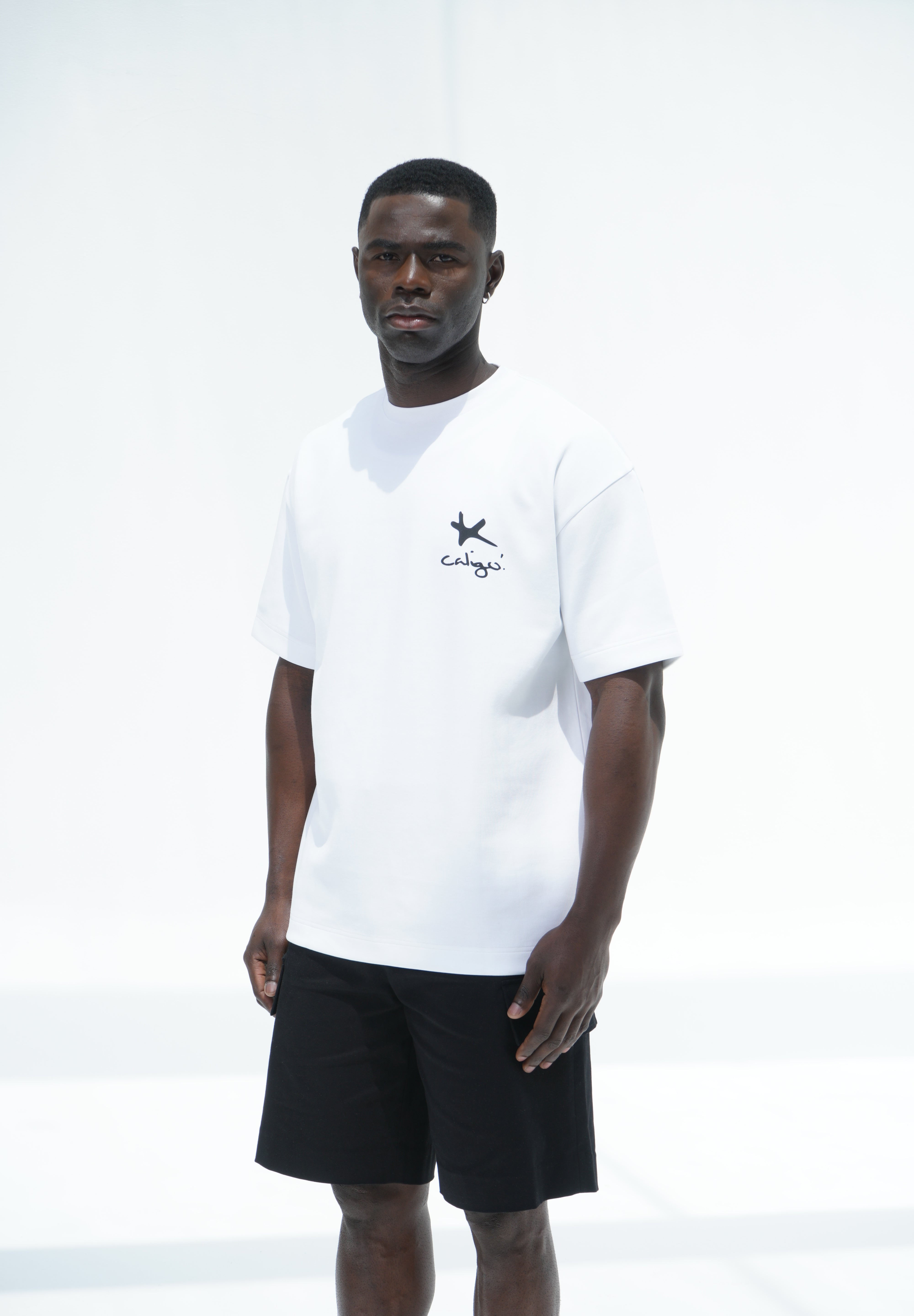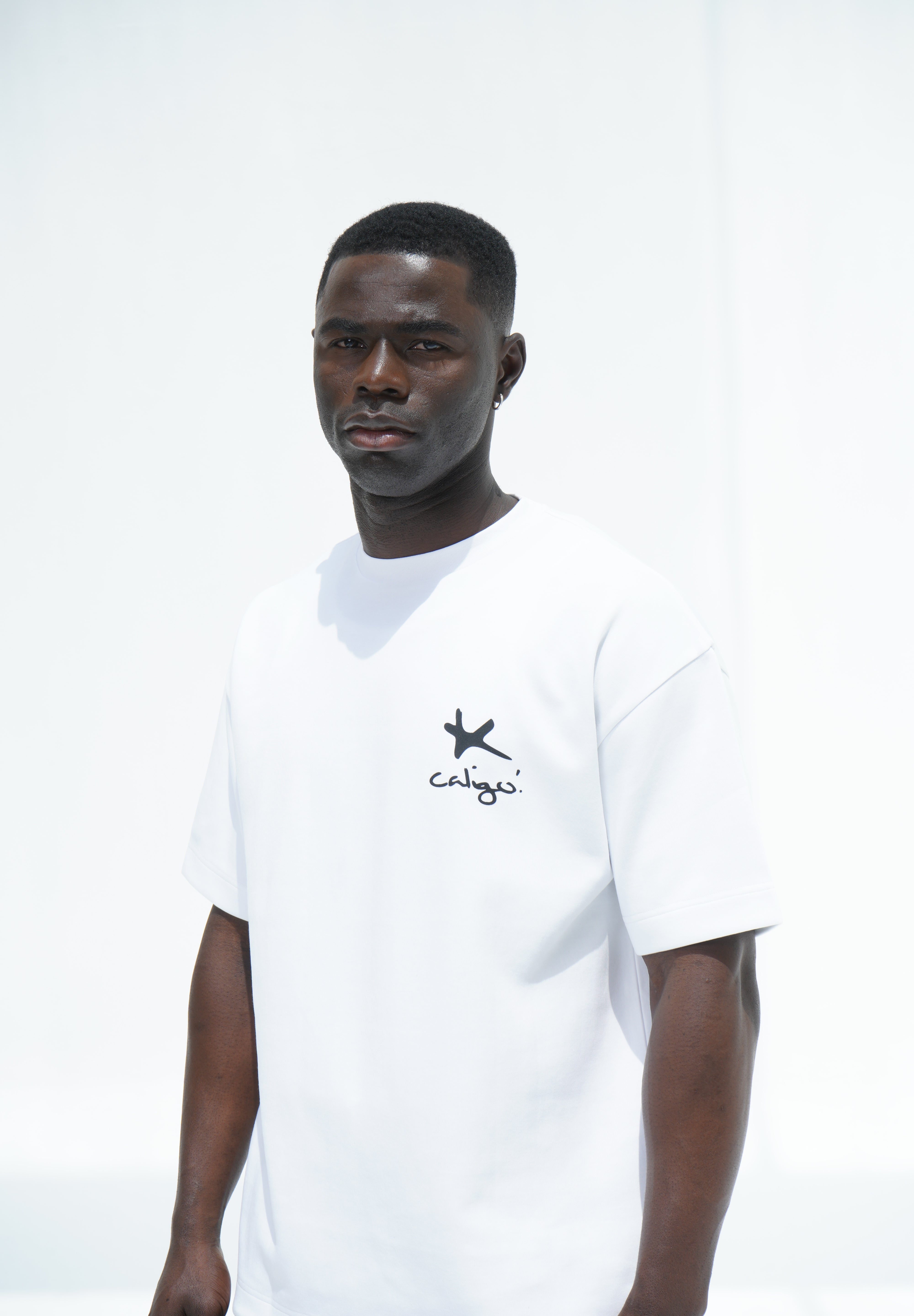 Crafted from heavyweight 280gsm 100% cotton, this white t-shirt combines comfort with distinctive style. Featuring the CALIGO graphic text and a star emblem on the left breast, it offers a clean, crisp look.