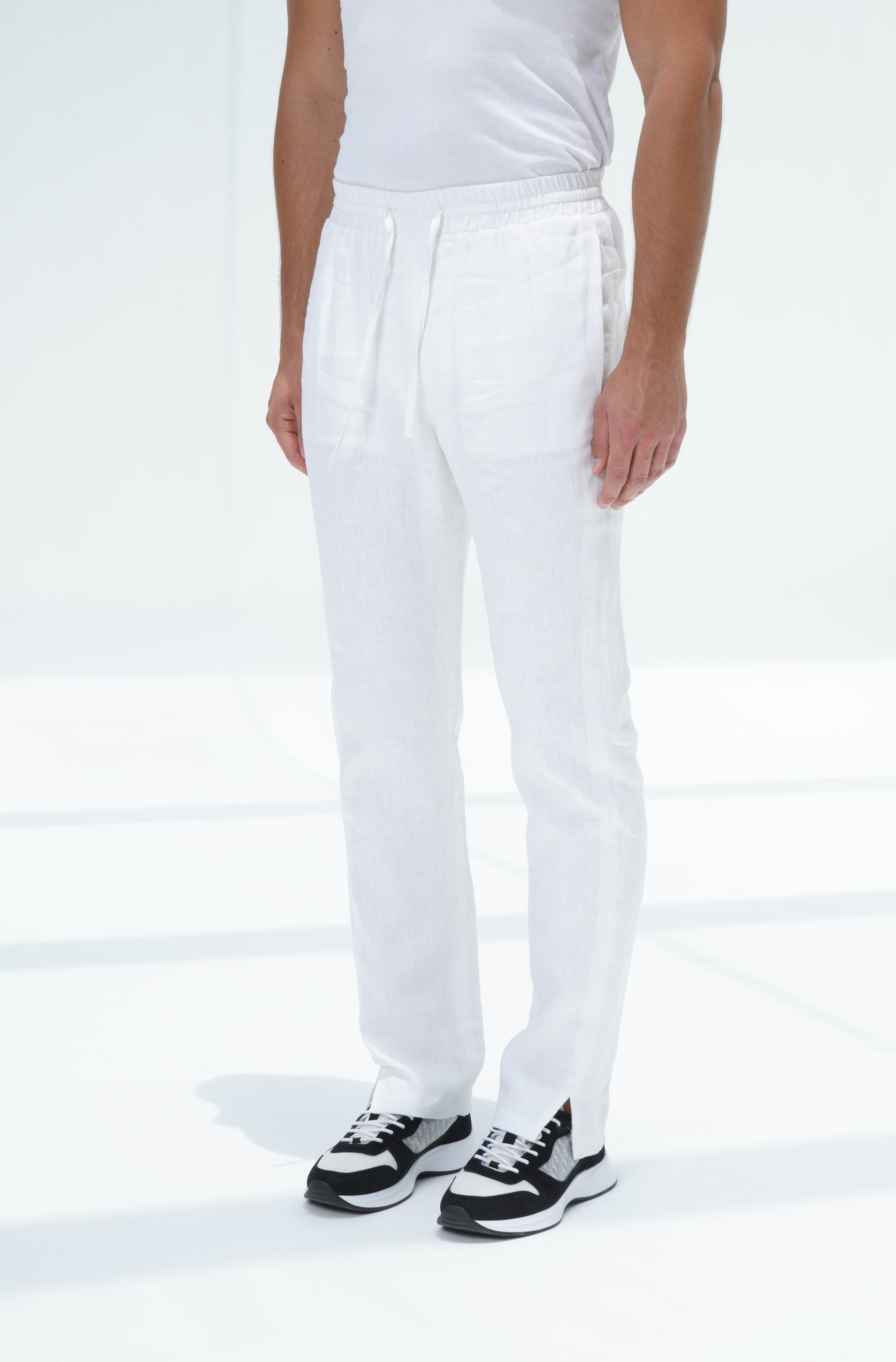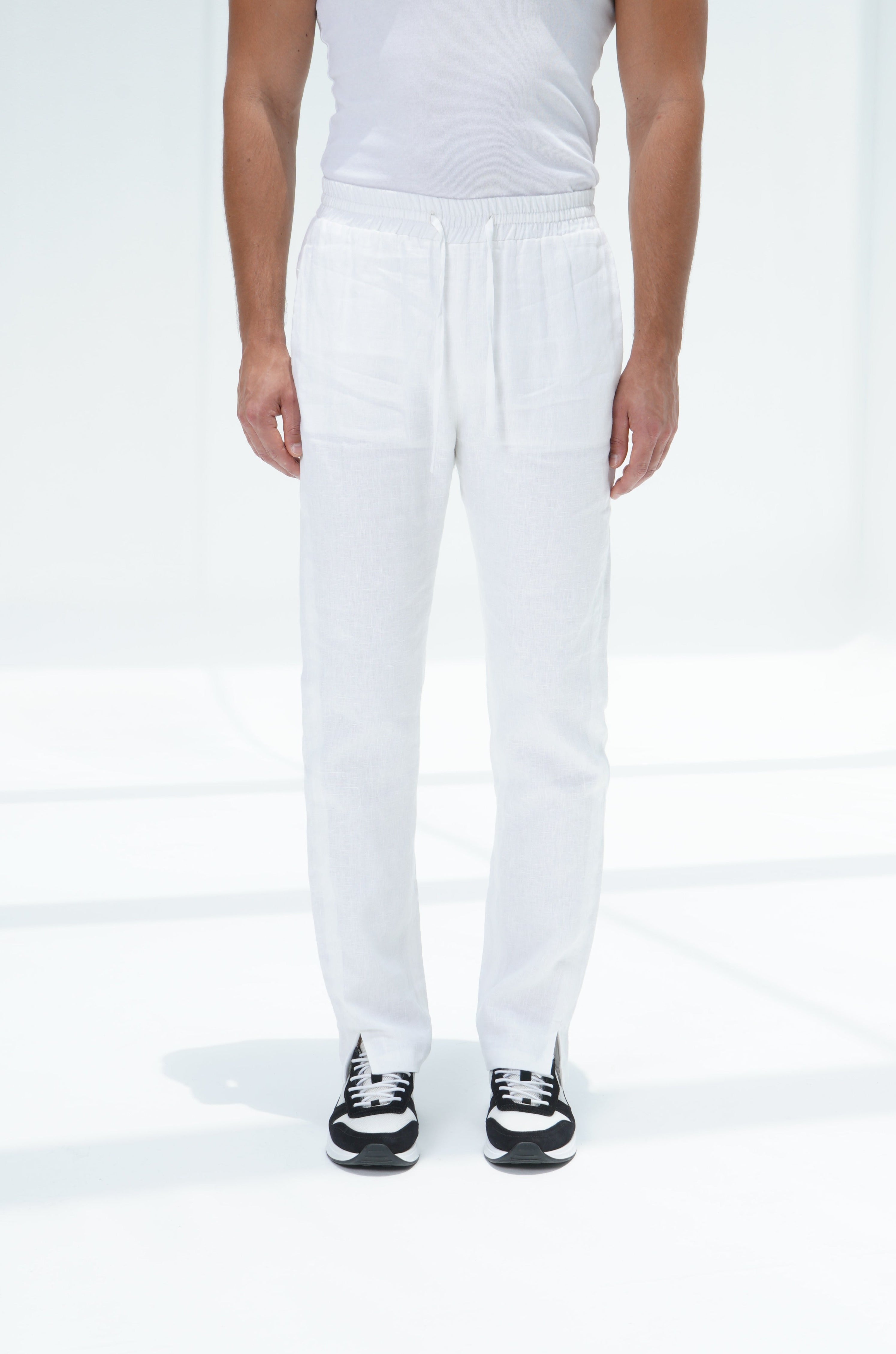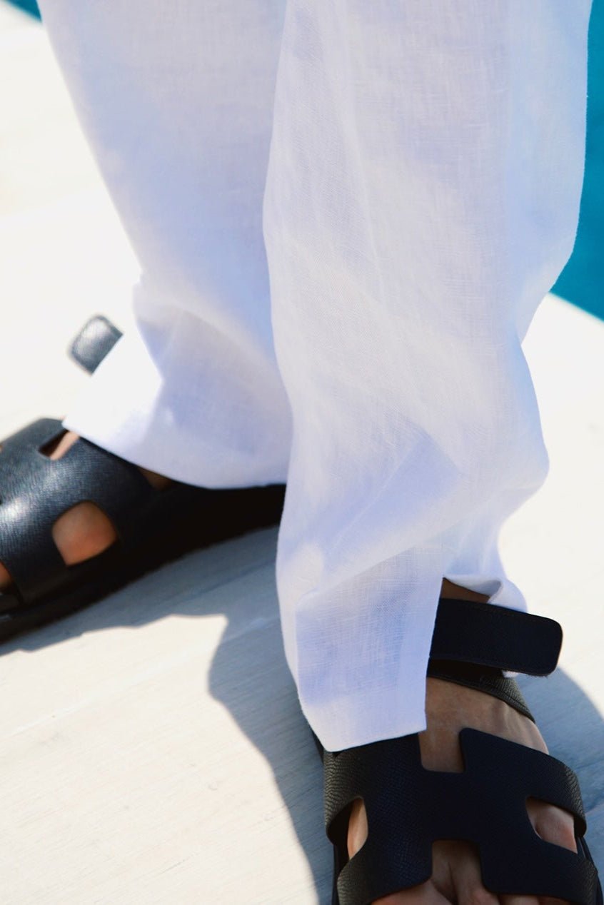 Crafted from 195gsm 100% pure linen, these relaxed-fit trousers boast an elasticated waistband for supreme comfort. Enhanced with a split hem along the leg's outer seam, they offer an extra touch of laid-back elegance.